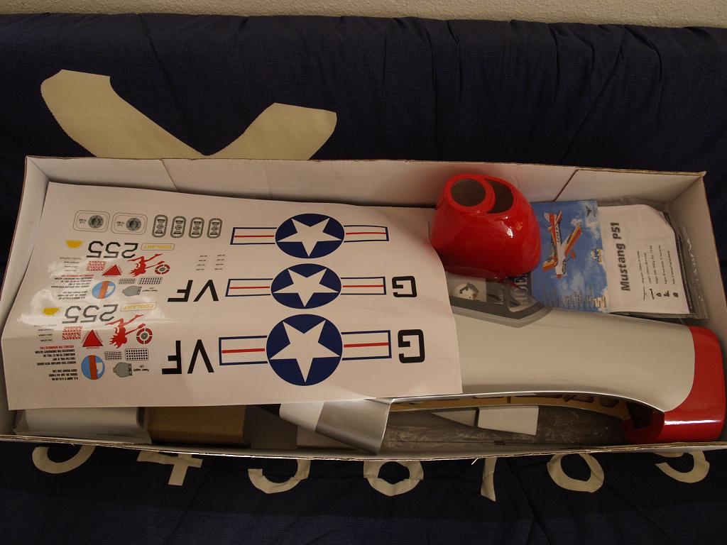 Hola a todos, pues si, al final me he comprado un p51 de phoenix model, 1550mm de ala y para un 60 de dos tiempos. Yo iba por un extra y al final me he traido este que no esta nada mal. Las primeras impresiones no son malas, tiene un acabado muy bueno, viene con las transmisiones de cola ya montadas (eso que nos ahorramos), y por cierto, muy bien montadas, tren retractil (incluido), flaps. Las partes moviles tanto en cola como en alas ya vienen pegadas y aseguradas de fabrica con alfileres. Un total de 9 servos, si como os lo digo 9. Os pongo algunas fotos, ya os pondre mas a medida que vaya acabandolo, si alguien lo tiene agradeceria comentarios o algun truco de montaje, ya que la unica pega que le e encontrado es que las intrucciones son escasas y para colmo en ingles, supongo que la mayoria de modelos vendran asi, pero para los que no controlamos el anglosajon es una gran p..tada.
