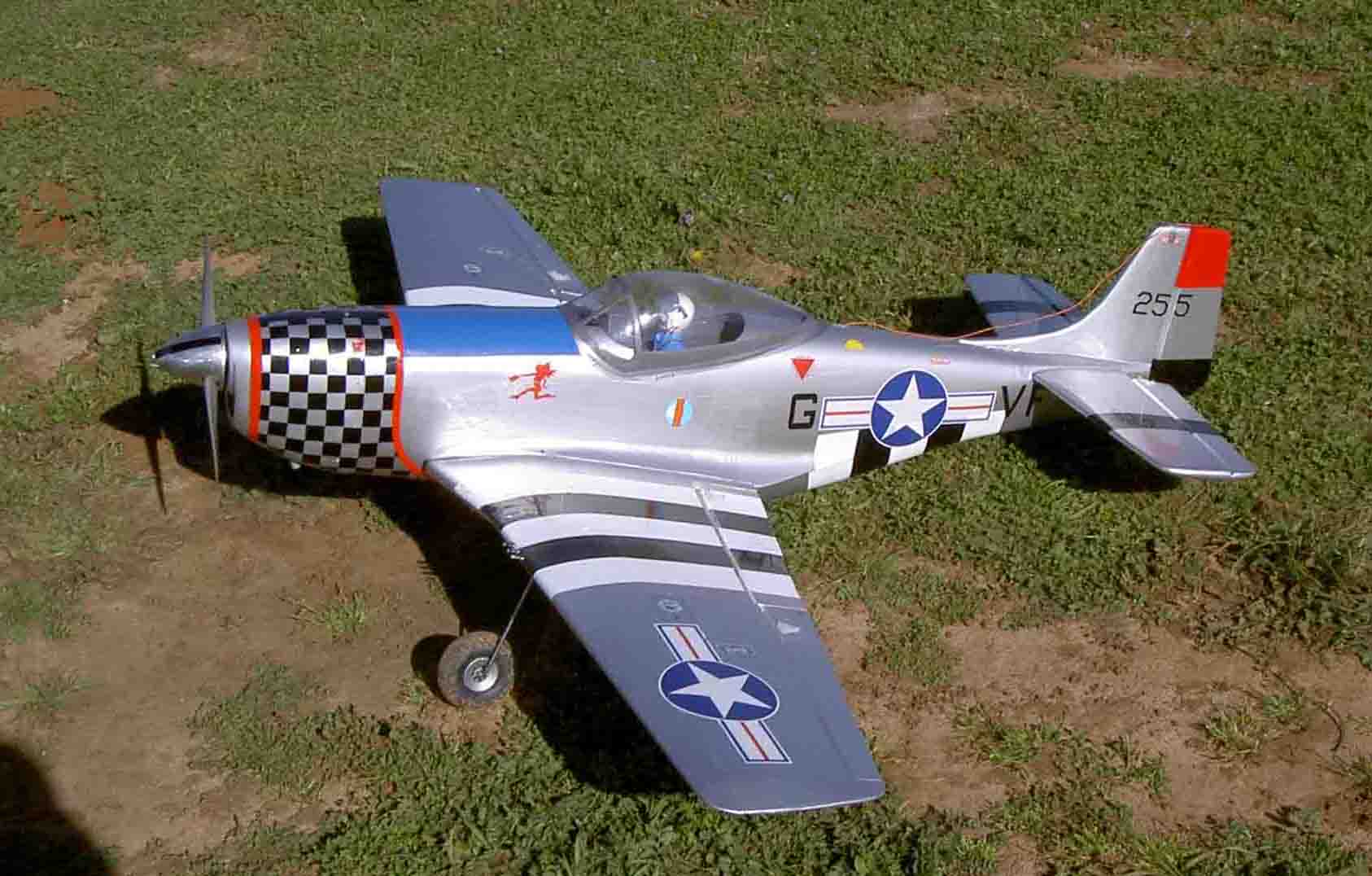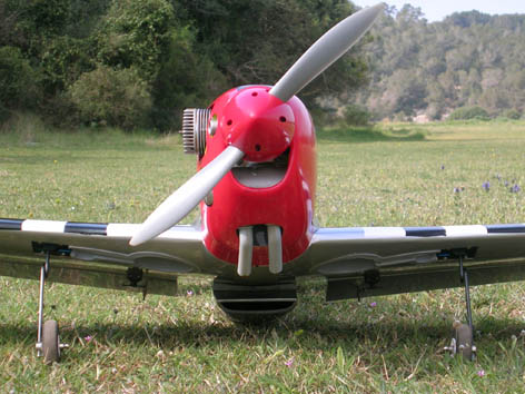 Yo tambien lo tengo con un Saito 91, le he escondido los servos dentro de las alas, como ha hecho Fradequero, le he puesto un sólo servo de profundidad, como ha hecho JordiFG y lo he tuneado un poco: he cambiado la decoración por uno qure existe en la realidad y le he puesto las bandas negras y blancas de "la invasión" por debajo las alas, parece otro :wink: