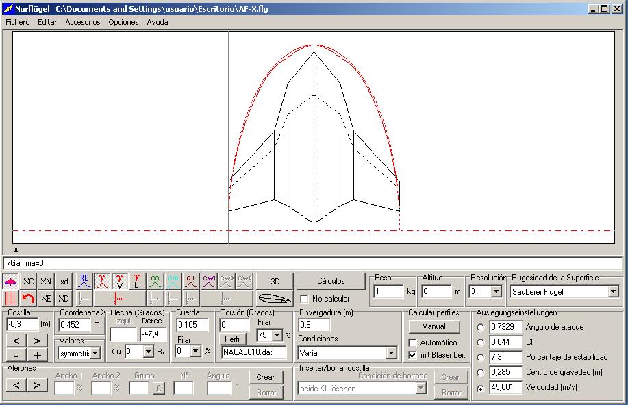 Edu ha hecho algunos calculos con el programa XLR5 y sale una velocidad de perdida de unos 40km/h quizas un poco elevada, pero si lo que queremos es correr (porque estoy seguro que superaremos los 160km/h) no hay mas remedio que sacrificar el vuelo a baja velocidad.