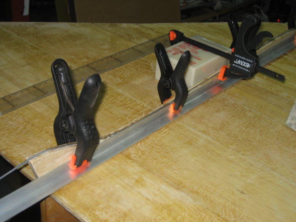 El resto del avión, es decir el fuselaje, patín inferior y refuerzos del ala, les he aplicado 3 manos de tapaporos nitro, con lijados intermedios de forma que no ganase mucho peso. El patín inferior lleva un alambre de acero fino pegado con epoxy para protegerlo. Cuando fui a pegar el patín, me dí cuenta de que estaba algo curvo, así que se me ocurrió coger n perfil en L que tenía de aluminio (de los que venden en ferrerías), y colocarlo en el lateral sujeto con pinzas. El perfil haría que el patín estuviese completamente recto a la hora de pegarlo al ala. Y para asegurar que estuviese perpendicular, una pequeña batería de plomo a modo de escuadra.