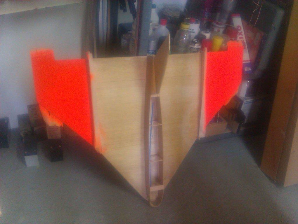 Tuve que quitar los refuerzos del ala y el patín inferior, para poder mojar el ala con agua muy caliente, ponerla encima de una mesa de mármol (que es 100% plana), y colocar unos buenos pesos hasta que secase. Una vez seca, el revirado se había corregido en un 95%, pero ese 5% no me gustaba un pelo.... me gusta que lo que tenga que ser plano, sea plano, y lo que tenga que ser curvo, que sea curvo. Así que decidí forrarla con fibra de vidrio en ambas caras (ahora que lo pienso, tal vez sólo debería haber dado fibra a la parte inferior), para quitar ese revirado que quedaba y asegurar una gran rigidez del conjunto.