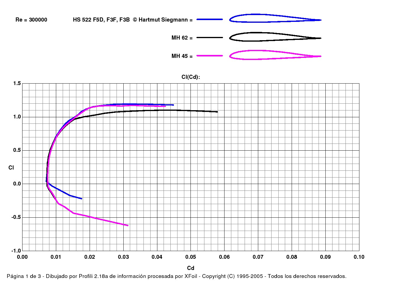 Imagino que dependerá lo que se quiera hacer, el HS-522 tiene un Cm menor que el MH45, sore el vuelo invertido a AMBAS hay que tenerle cuidado. En lo particular no usaría el MH62 en un ala con la geometría de la Weasel, hay que tomar en cuenta que la Weasel es muy sensible en profundidad de hecho si se vuela con una emisora sin ATV aún reduciendo al máximo el movimiento es casi involable porque rápidamente entra en pérdida y hace un tip stall que no la saca nadie. AMBAS aún volando en bajas condiciones hay que llevarlas con velocidad y hacer los virajes amplios, mientras menos se use la profundidad mucho mejor. En alabeo es un ala sensible pero dócil que se deja llevar y deja hacer.HOMEOCELL T.Mestre escribió:Adjunto unas graficas donde he comparado varios perfiles y creo que en invertido es mejor el MH45 y a menos RE las graficas son es muy parecidas, opiniones