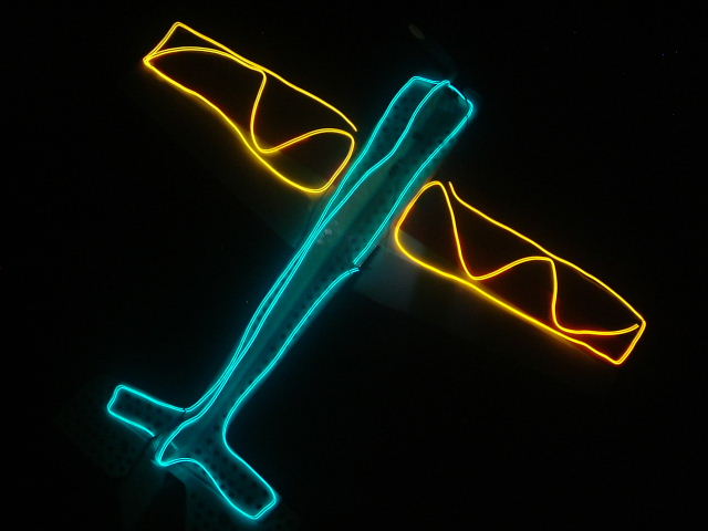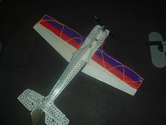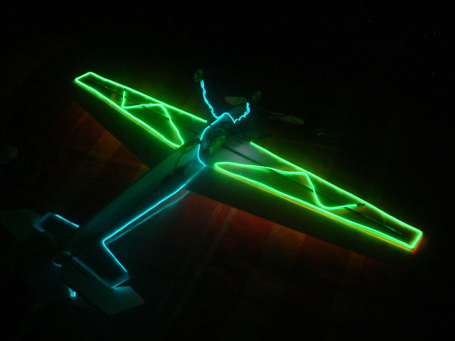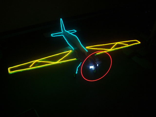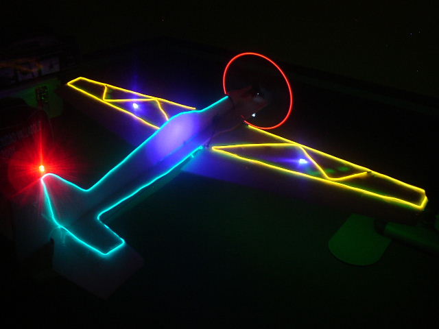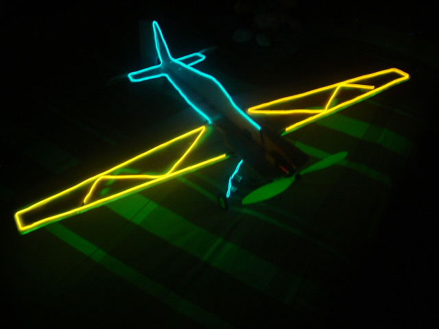 De momento he puesto las luces por encima a un depron que tengo que el pobre esta cascadisimo, por ver como quedaria, la idea es poner la parte superior de las alas en naranja, la inferior en verde y el fuselaje en azul. Tambien tengo idea de poner en el extremo del ala izquierda y de la parte exterior del timon de profundidad izquierdo un led blanco y en los derechos rojo. En la panza voy a poner un led blanco que ilumina un rectangulo de unos 7*2 de metacrilato, para tener una vision rapida de cuando esta del derecho y cuando del revés.