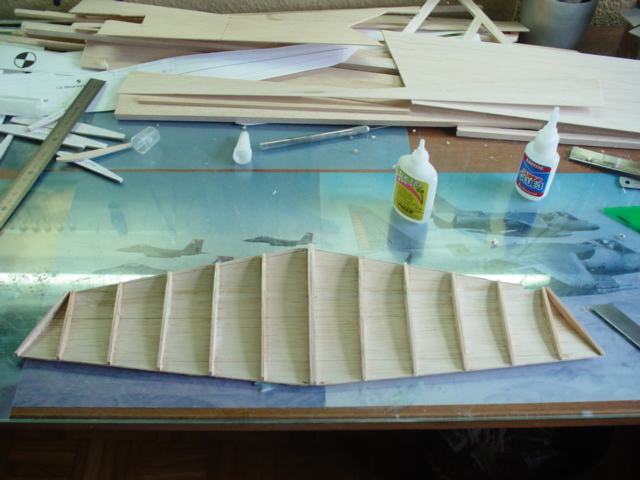 El ala lista por el extradós. Ya he recortado la balsa sobrante. Antes de pegar la chapa del intradós, he acanalado un poco las costillas y he pegado la varilla de fibra.