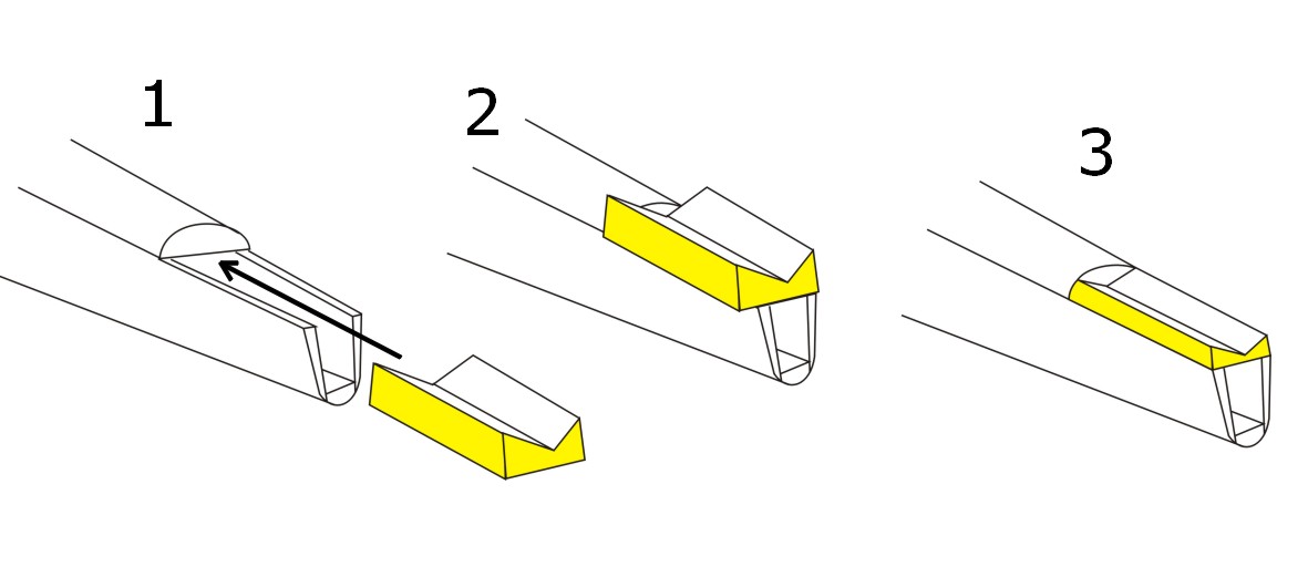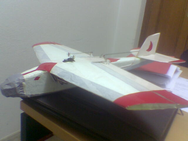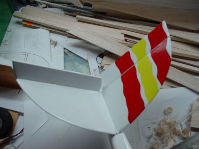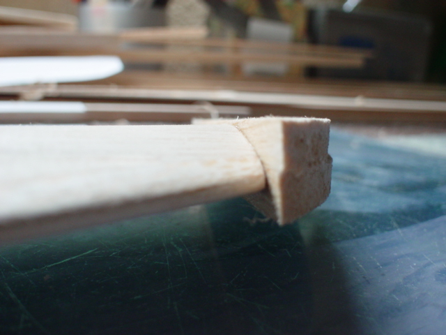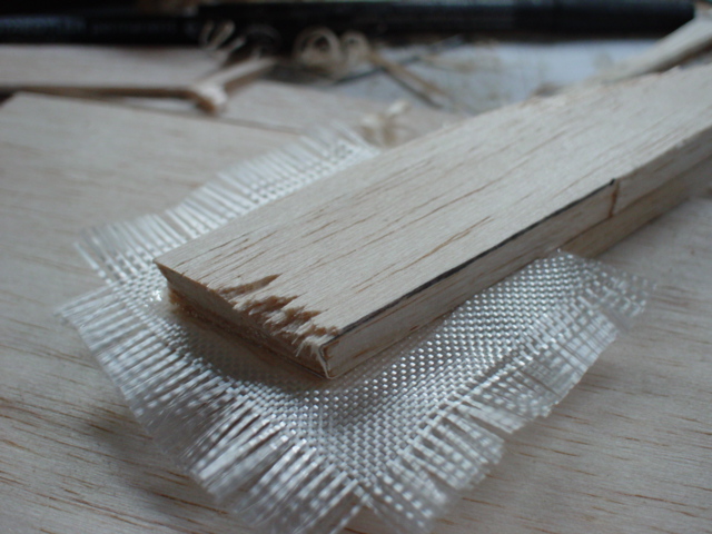 El ala ha salido sorprendentemente rigida. Aún así, le he metido una varilla de fibra de 2mm. Es facil, he acanalado las costillas (una vez montadas) con una lima a la altura del CG y he pegado la varilla con algo de ciano.