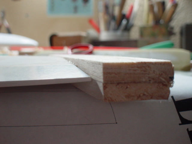 Con un poco de paciencia, se transporta la posición de cada costilla a la chapa de balsa de 1,5 mm. He tenido que pegar dos chapas juntas de canto.