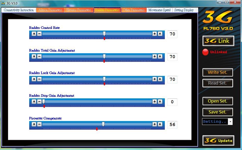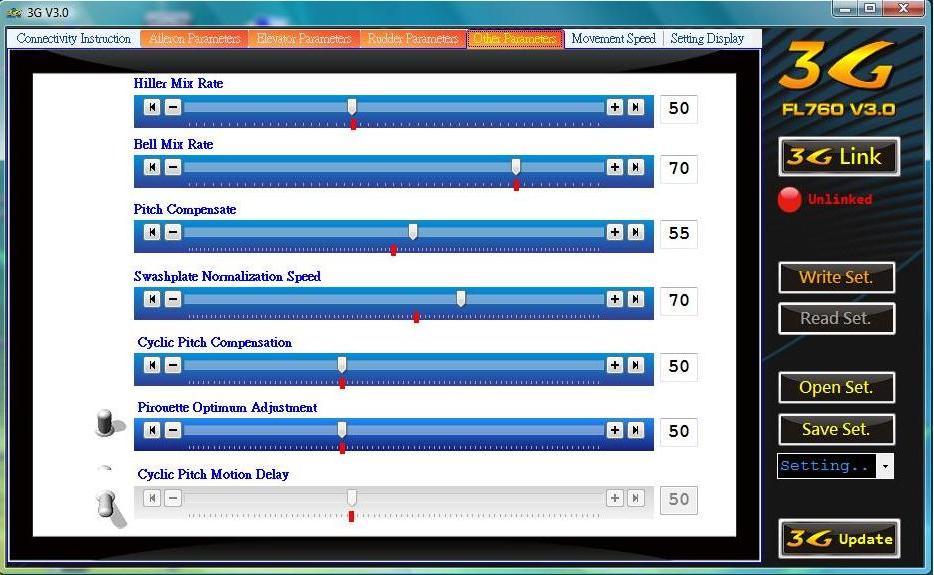 luismabel escribió:Hola, es reacción del heli se puede corregir entrando en el programa del 3G (con el ordenador) en el apartado de " Other Parameters" y luego se cambian los porcentajes de "Cyclic Pitch Compensatión" . Haces pruebas hasta que el heli deje de hacer este vicio.