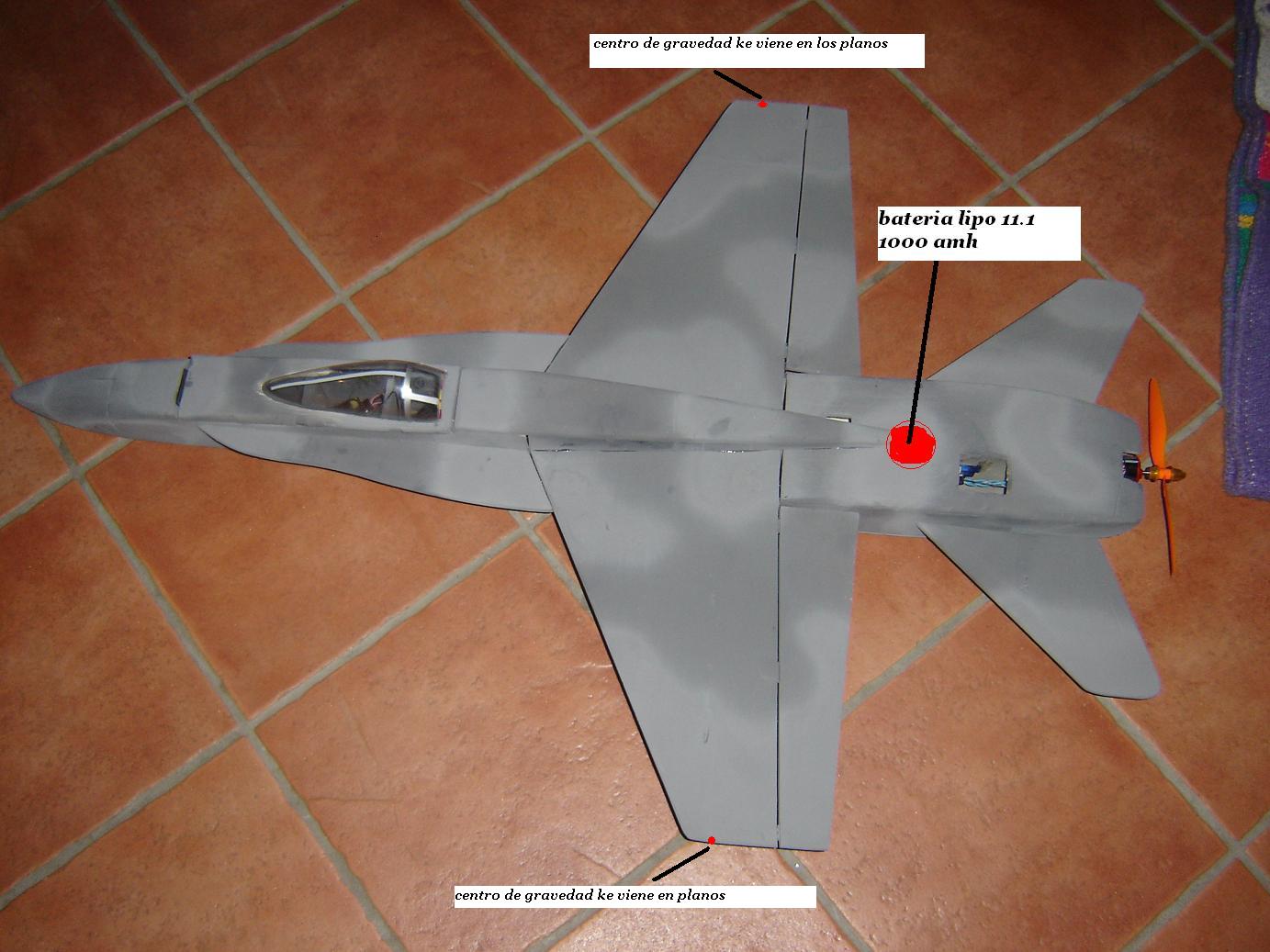hola he construido este f-18 en depron de 6mm pero hay un par de fallos ke siguen dandome la lata ,uno es ke el centro de gravedad lo tiene muy atrasado y le tengo ke poner la bateria muy atras para ke cuando lo coja por las alas a 1/3 del del borde de atake del ala el avion se kede centrado y normalmente la bateria por lo ke e leido y visto en fotos va alante casi en el morro , en la foto ke pongo la bateria me kedaria donde esta el punto rojo . y otra cosa rara ke le veo es ke sugetandoal con el morro mirando acia el cielo acelero a tope pero el avion no tiende a subir si no le alludo yo con un enpujoncito acia arriba (¿¿eso es normal??)ah solo le falta en la foto montarle los alerones para el timon de cola pero no se los pondre moviles los dejare fijos . aver si me podeis echar una mano con esas dos dudas, gracias