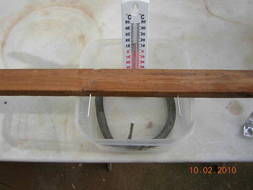 cubeta de tuperbare para la electrolisis con aro de plomo reciclado (catodo) y termometro de los chinos de hasta 50 cª