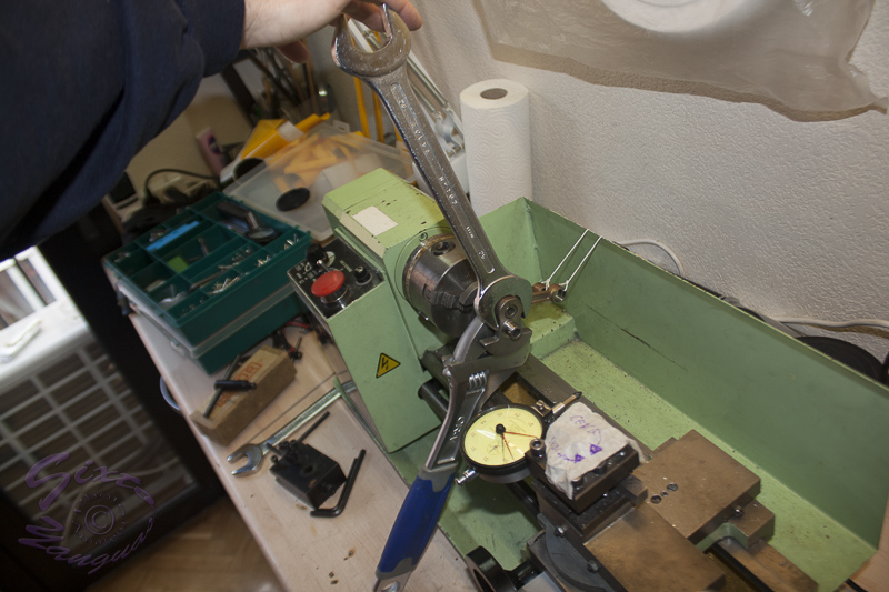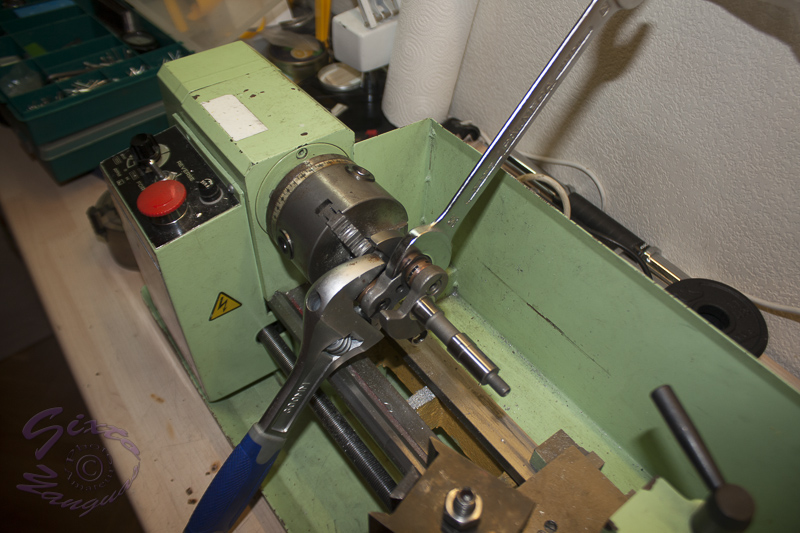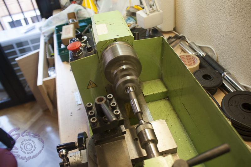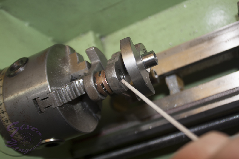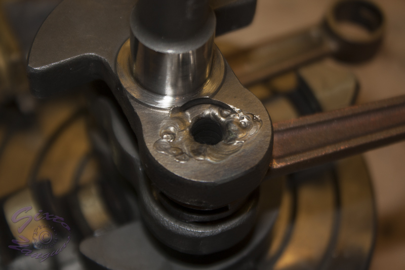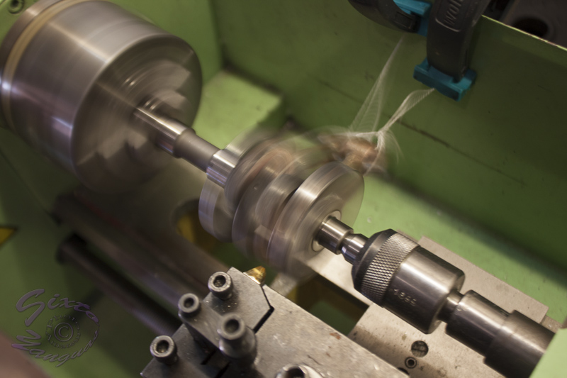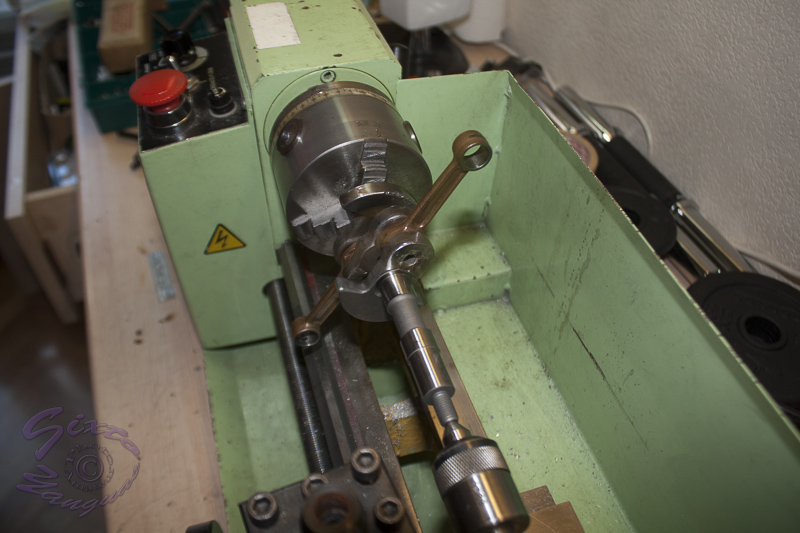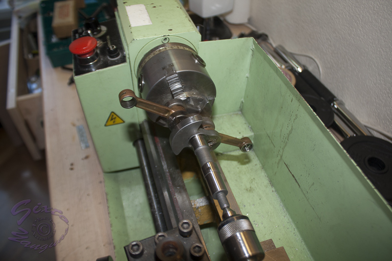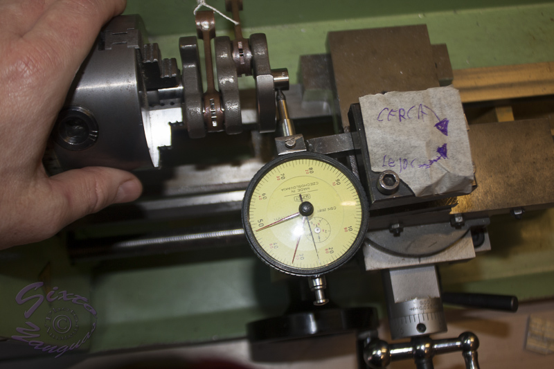 Este es el cigueñal. Lo primero es medir la distancia entre los dos platos, no sea que se moviesen... Luego marcamos los bulones para ver si giran, porque lo ideal hubiese sido que estuviesen tan flojos que se pudiesen girar 90º, para soldarlos mejor. Luego los sujetamos en el torno he intentamos hacerlos girar. Ni de coña... solo giro uno de ellos, el que une la pieza intermedia con el cigueñal corto (Trasero), los demás como piedras, quizás con unas llaves más grandes y un torno grande... yo no pude desde luego.