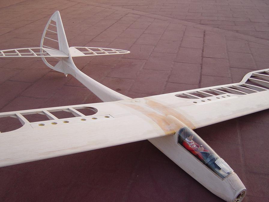 Amigo Yoyo, si me permites la opinión en el tema del Ninja pues opino como los demas. Realmente no creo que merezca la pena el hacer dos semialas. Tal y como viene va que chuta y bien construída, con lo que tú no tendrás problemas por lo que se vé de tus trabajos, aguantará todos los esfuerzos normales a que lo sometas durante el vuelo a este velero de sus características. No se te olvide el reforzar el centro de las alas con la tela, poner la pieza de refuerzo en contrachapado en donde sujetas el tornillo y listo. El fuselaje es harina de otro costado. En mi caso el morro lo tallé partiendo de un bloque de pino y era de la Sig pero ya venía con el contrachapado más malo que he visto en mi vida y calados en la parte trasera. Reforcé la parte inferior del morro y panza con fibra de vidrio y epoxy la igual que las fotos del BOT pero fué innecesario puesto que lo rompí varias veces en donde todo el mundo lo hace, es decir por la mitad justamente donde termina el borde de salida. Refuerza esta zona colocando un poco de contrachapado fino y exteriormente ponle tela tambien. En cuanto a la sujección del tornillo del ala coloca otro bloque de pino de, al menos 1 cm. de grosor y hazle las roscas del tornillo. Sí pondría dos servos minis en el lugar del servo standard para conseguir el efecto de spoilerones, con flaperones apenas si notaba gran diferencia y trata de hacerlo ligero, lo bonito de este diseño es que te sorprenderá como se agarra con vientos flojos. Algo de diferencial de alerones tambien le gusta, sobre todo para paliar un poco el tema de los giros cerrados, usa un dual rate con dos recorridos uno para volar suave con vientos flojitos y otro con algo más de mando para cuando apriete. Loopings tras un ligero picado, toneles seguidos y vuelo invertido siguiendo el patrón del ocho plano en la ladera es posible con buena ascendencia incluso en las dunas en donde volamos tanto tu como yo habitualmente.