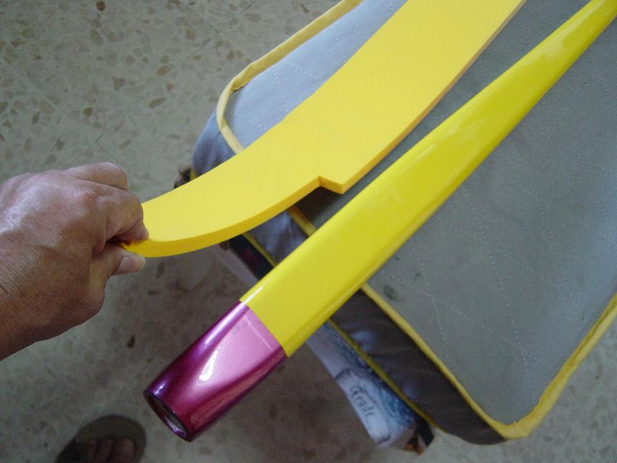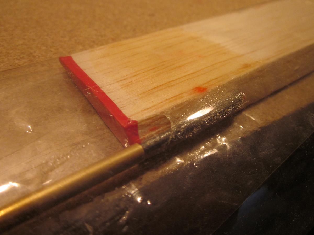 Juan, los brazos de los alerones no están bien :( no sé a ciencia cierta como lo has hecho pero viendo el varillaje al aleron y el complemento de balsa que has puesto pienso que hayas hecho el zurco en el larguero del borde de fuga lo que posiblemente te causará una falla estructural del ala por debilitarlo (corrígeme por favor si me equivoco o ház caso omiso a este comentario) dado que veo el brazo al aleron tan separado de este y con el complemento de balsa. Ese tipo de brazos se montan haciendo los zurcos en el brode de fuga, primero haces los de las parte inmoviles que envuelven la camisa de latón y esta debe quedar al ráz del borde de las piezas, una véz hecho el zurco procedes a pegar el brazo a cada uno de los bordes de fuga fijos con epoxy y cuida que la camisa de latnó no se pegue a la varilla, con un poco de vaselina en estas áreas lo evitas. Una véz esten secos pegas los bordes de fuga fijos junto a los brazos al larguero del borde de fuga del ala, posteriormente le haces un zurco menos profundo al aleron dado que no tiene la camisa de latón donde encastrará la varilla luego haces el agujero para que la varilla en "L" encastre en el aleron pegándolo con epoxy. Para esto es recomendable colocar cinta plástica (celo) en el larguero del borde de fuga para evitar que el aleron y la varilla se peguen al larguero. Como lo has puesto te puede traer serios problemas en un avión como ese :( . Aquí te pongo una secuencia de los alerones del Ninja que son similares a los del AR-1