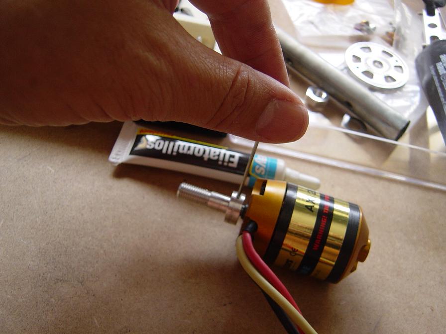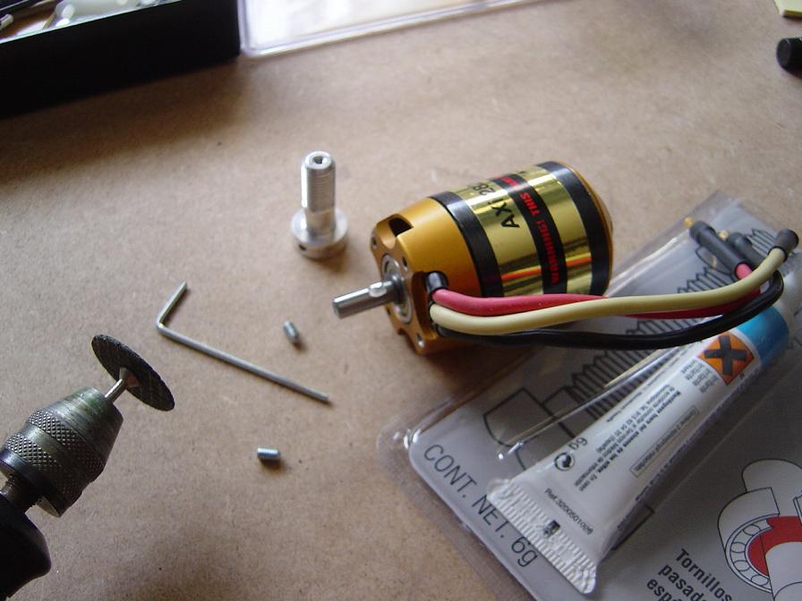 Toda la instalación de propulsión, equipo de radio, transmisiones y demás están terminados. El modelo dentro del margen de centraje sin añadir ni un sólo gramo de plomo, pues desde el primer momento estuvimos jugando con la instalación de los componentes y refuerzos en la extructura para hacer innecesario el añadir lastre si se pudiera evitar y creo que así ha sido. Quizás un pelín cabezón al menos en el taller pero ya veremos en el vuelo. Los tornillos de la helice plegable los sustituí por otros de cabeza allen y tuercas autoblocantes por el tema de la seguridad, así como unas muescas que efectué en el eje del Axi y puse fijatuercas así como en los tornillos de sujección del motor a la bancada.