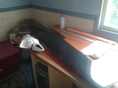 Bueno, hemos pegado esta mañana otro tironcito al forrado del modelo, ayer ya se hizo muy tarde y decidi no tocar , soy del que opina que en estas cosas mejor hacerlo todo con tiempo y calma, una buena musica y a trabajar.