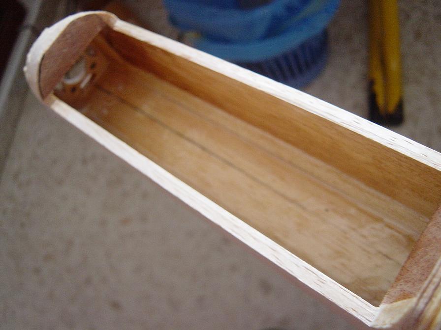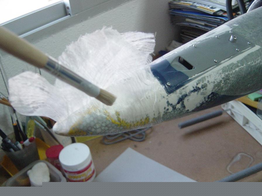 8) Alfredo, en el fuselaje no utilizo para nada el organdí, solo en las alas. El organdí no se adapta bien a curvas complejas, para el fuse es muchísimo mejor la tela de fibra de vidrio, como ejemplo pongo las fotos del refuerzo del interior del BOT y la reparación del morro del Habu.