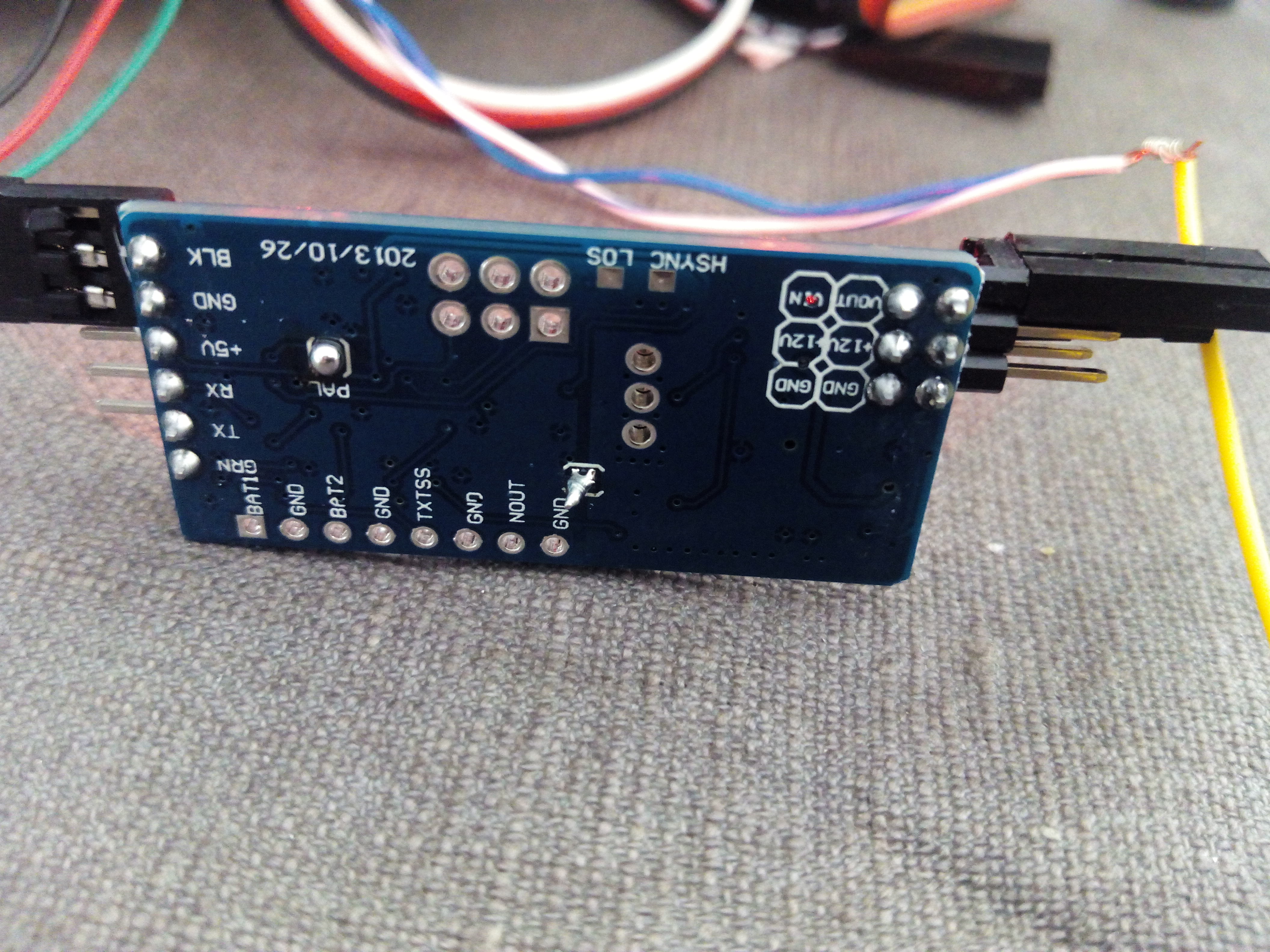 En un principio estaba todo cableado pero como no es problema de los datos de telemería, desconecté la antena. Así me quito de que sea problema de falta de energía o de interferencias de radio. Se supone que con la alimentación de 5v en la parte de datos, los 12V del otro lado y la salida de video, debería verse una imagen en negro con las rayas blancas sin datos del OSD, pero nada.