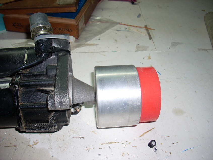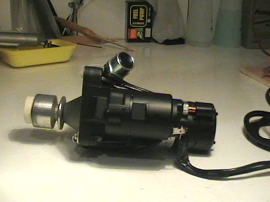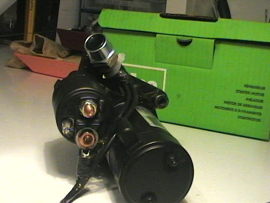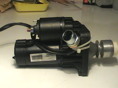 es un motor de arranque de un renault clio (lo compre en una tienda de recambios de automovil pero mas barato seria en un desguace) el vastago central tiene un pequeño aguero hecho, solo hay que repasarlo con una broca y hacerle rosca.Hay que tener en cuenta, que el sentido de rotacion del motor de arranque sea el que nos interesa para nuestro motor, normalmente viene marcado con una flecha.