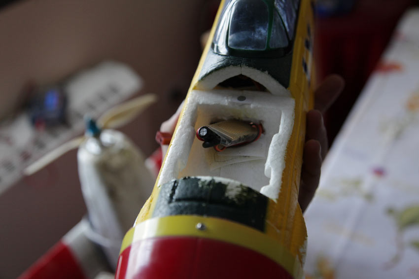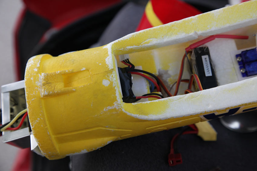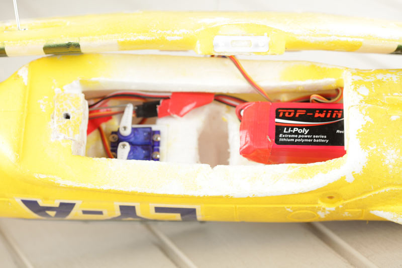 interior del fuselaje con la bateria de 11.1 2200 mha como veis cabe perfectamente y vuela mas estable con esa ubicación