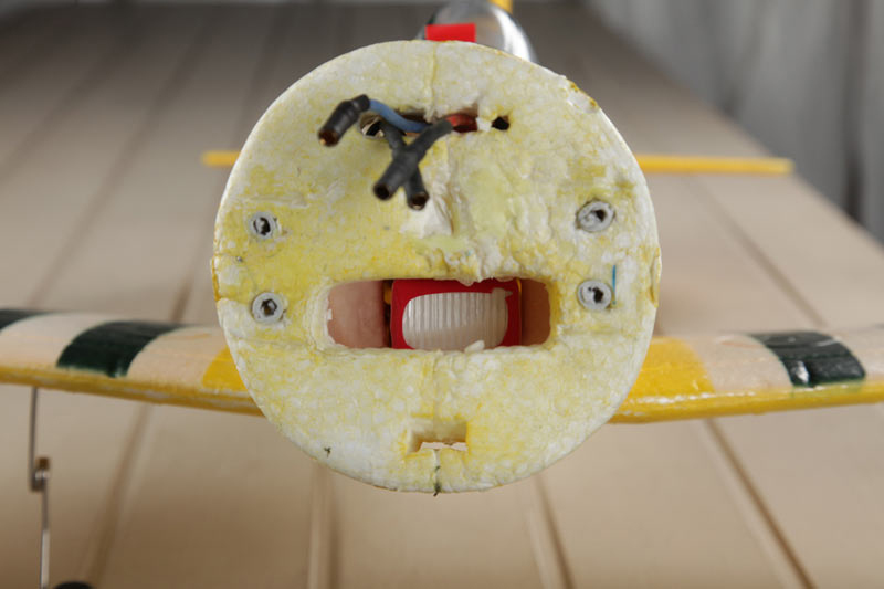 hoy en el ultimo vuelo despues de hincharme literalmente de hacer pasadas a 2 metro de altura, a la hora de encarar la pista para aterrizar.... sorpresa!!! alguien a puesto un poste de la luz en mi camino y zaaas porrazo contra ella... los bricos funcionan a la perfeccion!!!! se abolla un poco la bancada, el eje no sufre se mete hacia dentro, la carcasa roja con la cinta americana se abolla un poco pero no se rompe, el porta elices se sale y como siempre la estructura donde engancha el tornillo del ala se despega. pero poca cosa