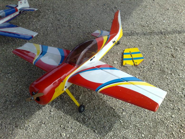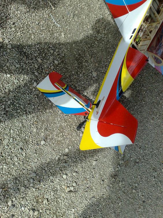 Esta mañana, con un dia esplendido para volar y 2l de gasofa y todas mis ganas, me marche hacia el campo de vuelo con mi yak bonito, lo monto y arranco el motor para el primer vuelo, despege perfecto, le doy una vuelta de trimado y todo bien, de repente me pega un coletazo y veo algo despegado en la cola, cundo me fije bien vi que medio estabilizador estaba completamente partido y colgando por la varilla de mando, con bastante motor y corrigiendo como pude me lo lleve a cabecera de pista y lo baje como pude en la parte exterior (el trigo esta mas blandito, jeje), al final consegi bajarlo bastante bien y quedo el avion entero. Motivo, creo que fue por culpa de las bisagras que se escaparon y al vibrar el mando partio el estabilizador.