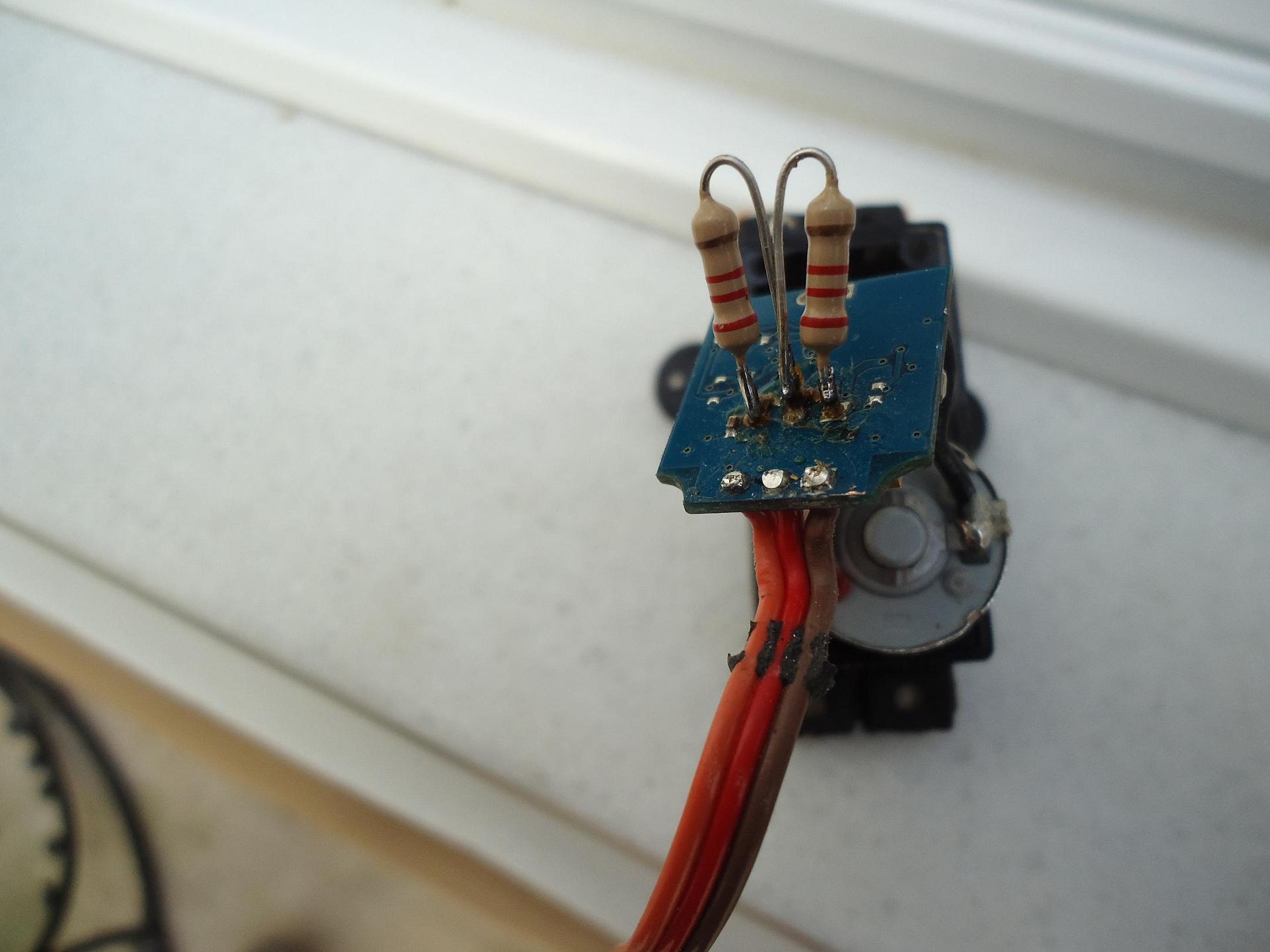 Vamos al grano coleguitas del foro, el tema del servo lo he solucionado colocando 2 resistencias iguales de 2,2k y 1/2w soldadas como se ve en la foto, el montaje va perfecto para lo que quiero ya que el servo gira hacia ambos sin problemas, parandose cuando se deja en reposo el estik