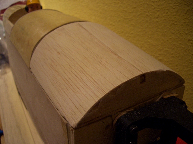 La parte trasera superior consta de cuatro semicuadernas de balsa de 3 mm. Se ha cubierto con tiras de balsa de 1.5 mm para conseguir la forma y se ha puesto una capa de fibra de vidrio fina