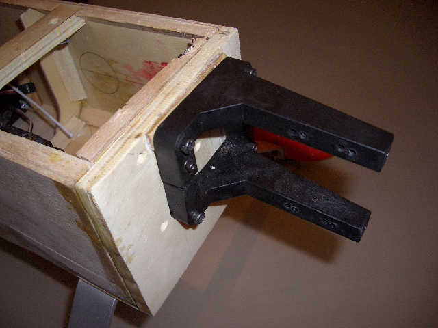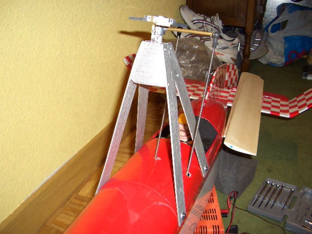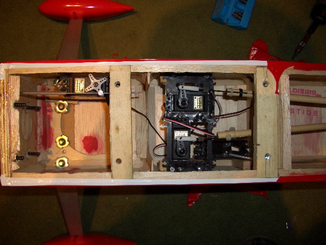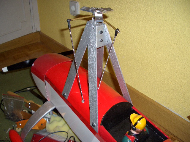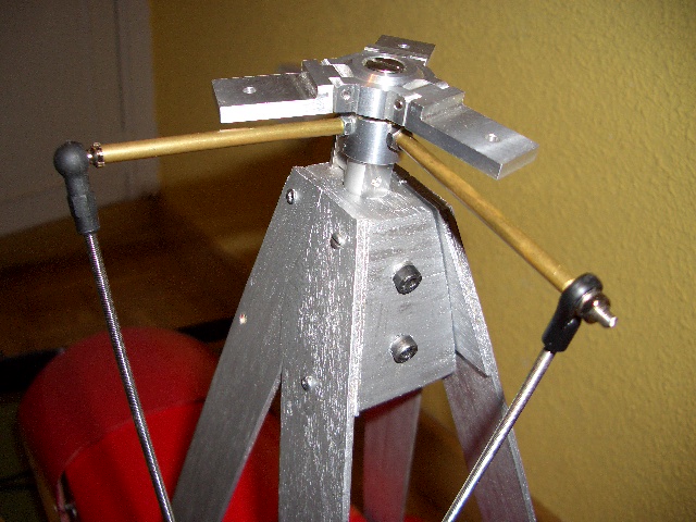 Aquí recurro en ambos casos a un redondo de pino con varillas de acero de 2 mm roscadas en los extremos. Los esfuerzos aquí son menores que en el rotor. Los servos son Futaba 3001, que son los estándar con rodamiento en el eje principal