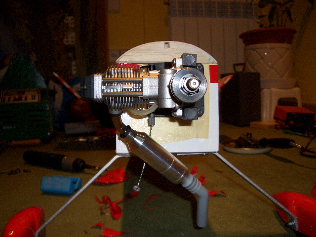 Se ha rotado la posición del carburador 180 grados, de tal forma que no es necesario taladrar la carena para acceder a la aguja de alta, ya que ésta sale por la parte inferior del fuselaje. Para acceder a la misma sin quemarme los dedos he colocado un cable de acero solidario a la aguja con un prisionero.
