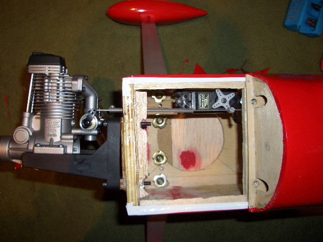 El servo es un Futaba S148 antiguo, ya que no se precisa mucho par. La transmisión es por varilla de 2 mm directa entre servo y barrilete de carburador… transmisión directa y precisa…