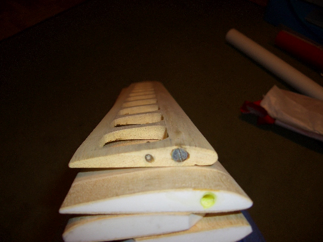 En mi caso, he partido de un listón de samba al que le he dado forma de perfil Clark–Y. Esta madera es bastante más dura y pesada que la balsa y tras el perfilado, el peso de las palas oscila entre 70 y 85 g, por lo que se hará necesario aligerarlas