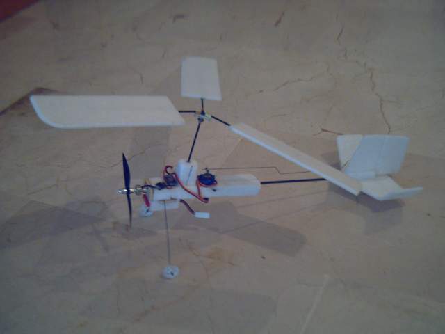 Aqui cuelgo algunas fotos del "aparato". Lleva un brushless 2000KV 10gr peso, un servo de 5gr, lipo 7,4v 500mAh, variador de 8amp 9gr.
