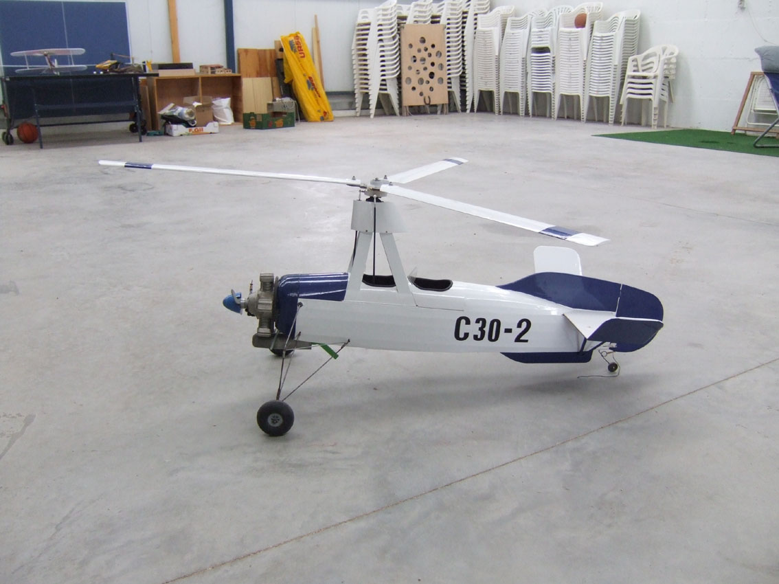 Por fin he terminado la semimaqueta del autogiro C30-2. Y además vuela, aunque solamente he hecho unos vuelos de prueba para comprobar centrajes antes de proceder al acabado del artilugio. Puedo comprobar también que las paradas de motor se resuelven con una suavidad similar a la caída de las hojas de los árboles.