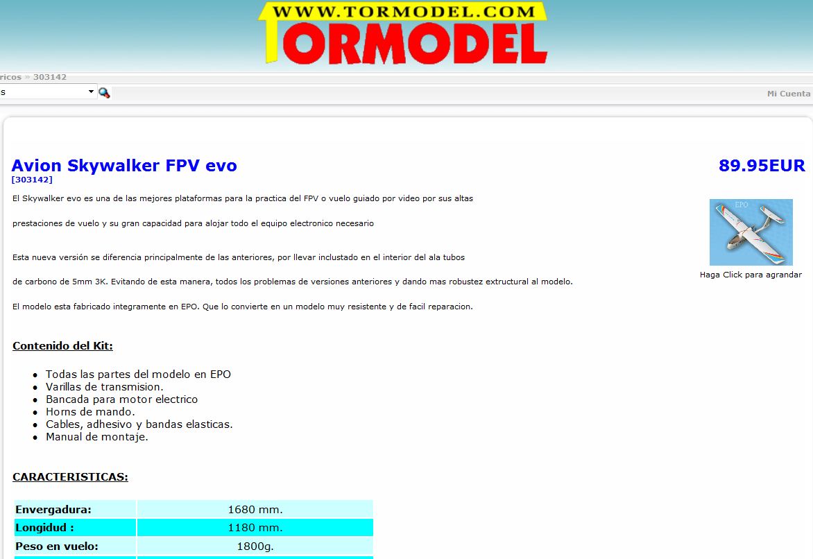 Hola he encontrado este avion, Avion Skywalker FPV evo, que parece ser más estable para la camara que quiero instalar, he encontrado alguna pagina en España donde lo venden, pero lo venden sin nada, pelao, ¿sabe alguien donde puedo conseguirlo al menos con motor, servos y variador, ó decirme que motor puedo ponerle, por lo demás me las puedo arreglar, muchas gracias.