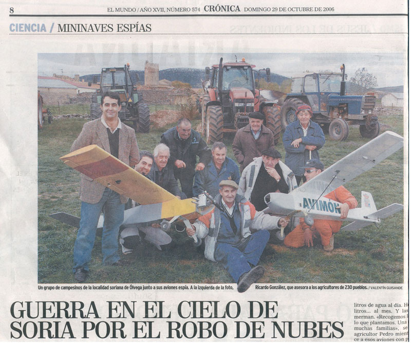 Hay un articulo muy interesante de un grupo de agricultores de Soria, creo recordar, que han comprado dos aviones de radiocontrol espias para vigilar sus cielos a una empresa que se llama AVIMON, ya que dicen que cuando va a llover aparecen en sus cielos avionetas que descargan yoduro de plata en las nubes para evitar que llueva. Con estos aviones de radiocontrol dotados de camaras pretenden gravar a estas avionetas y así poder demostrar que esto está ocurriendo, ya que nadie los cree.