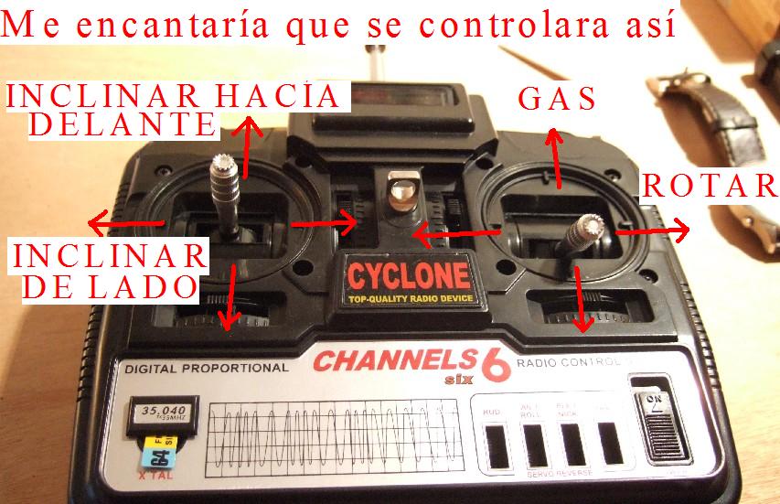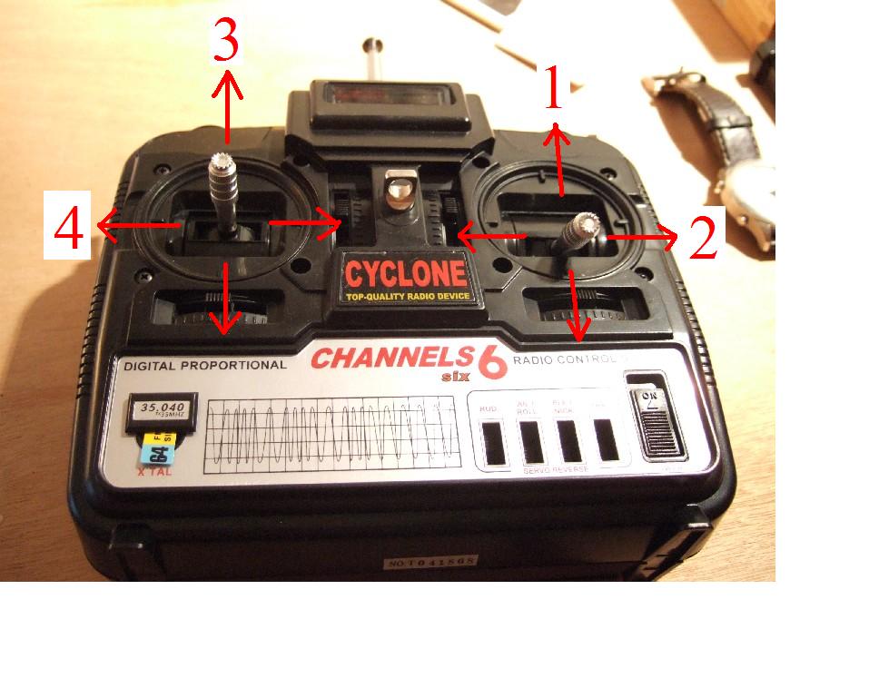 Me ha llegado el helicoptero un Lynx 380-XL http://cgi.ebay.es/ws/eBayISAPI.dll?Vie ... mot_widget y el tema es que el helicoptero esta muy bien, todo está bien ajustado lo que pasa es que no me gustan los contoles. Así por encima, el gas está a la derecha (1), para hacer que el helicoptero se incline hacia los lados está en el gas (2). Para que el helicoptero se incline hacia delante-atrás (3) está a la izquierda y para que rote está también a la izquierda-derecha (4).