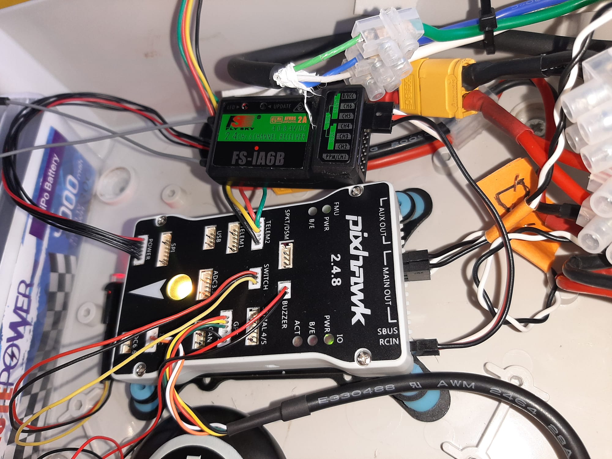 Bueno, finalmente he adquirido una pixhawk 2.4.8. Tras conectar todo de nuevo e instalar el firmware rover 4.0.0 el problema que tengo ahora es que no me arma los propulsores. Tengo telemetría, GPS, la emisora funciona correctamente según la calibración de misssion planner, etc. pero no me arma los propulsores. Lo conecto por cable y por telemetría con mi pc, pero 0 respuesta de los motores. Os dejo una imagen de como lo tengo montado temporalmente mientras compruebo que funcione. Mi duda es la conexión entre el receptor FSiA6B con la pixhawk. Es necesario que tenga SBUS? Este receptor tine iBUS pero no veo que ponga S-BUS por ninguna parte. Un saludo