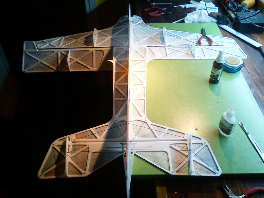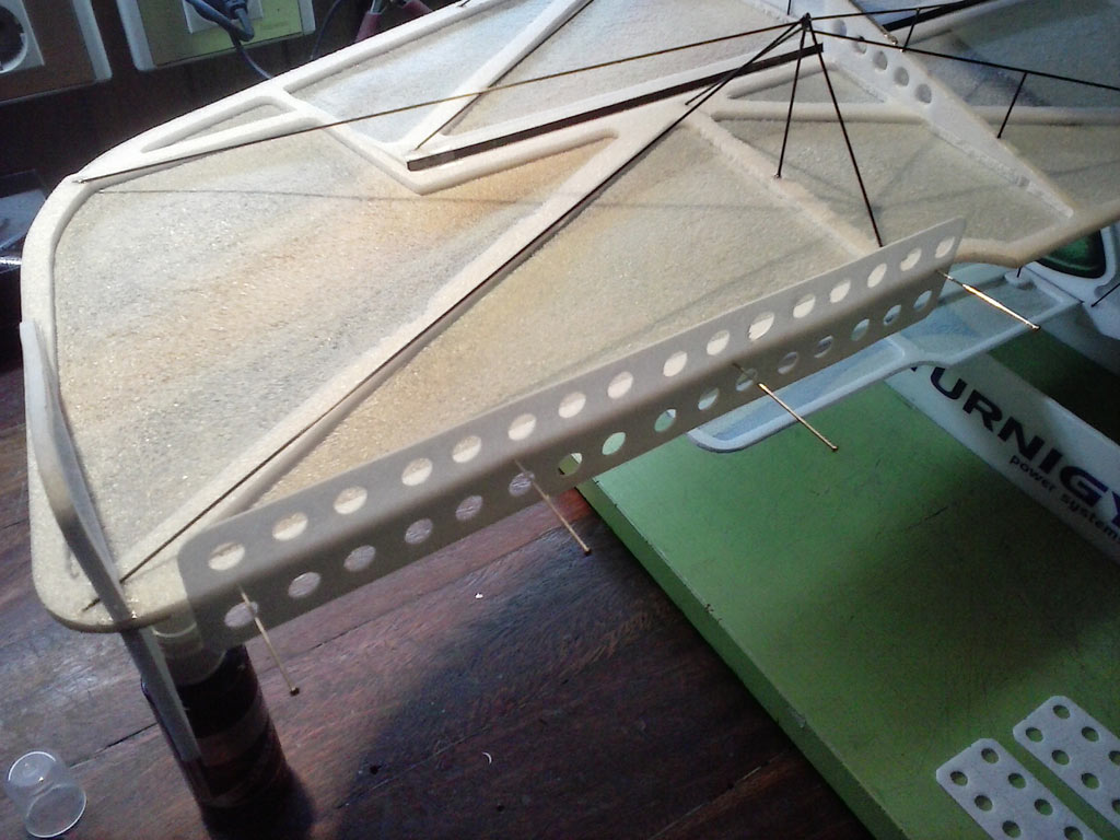 Okey, pues pondré una varilla de carbono para reforzar, ya que para hacerlo en los dos alerones con forma de tienda de campaña, no tengo carbono para tanto. En cuanto a la torsion, si que es algo que en principio no es nada que reseñar, pero para eliminarla hay que saber mucho.