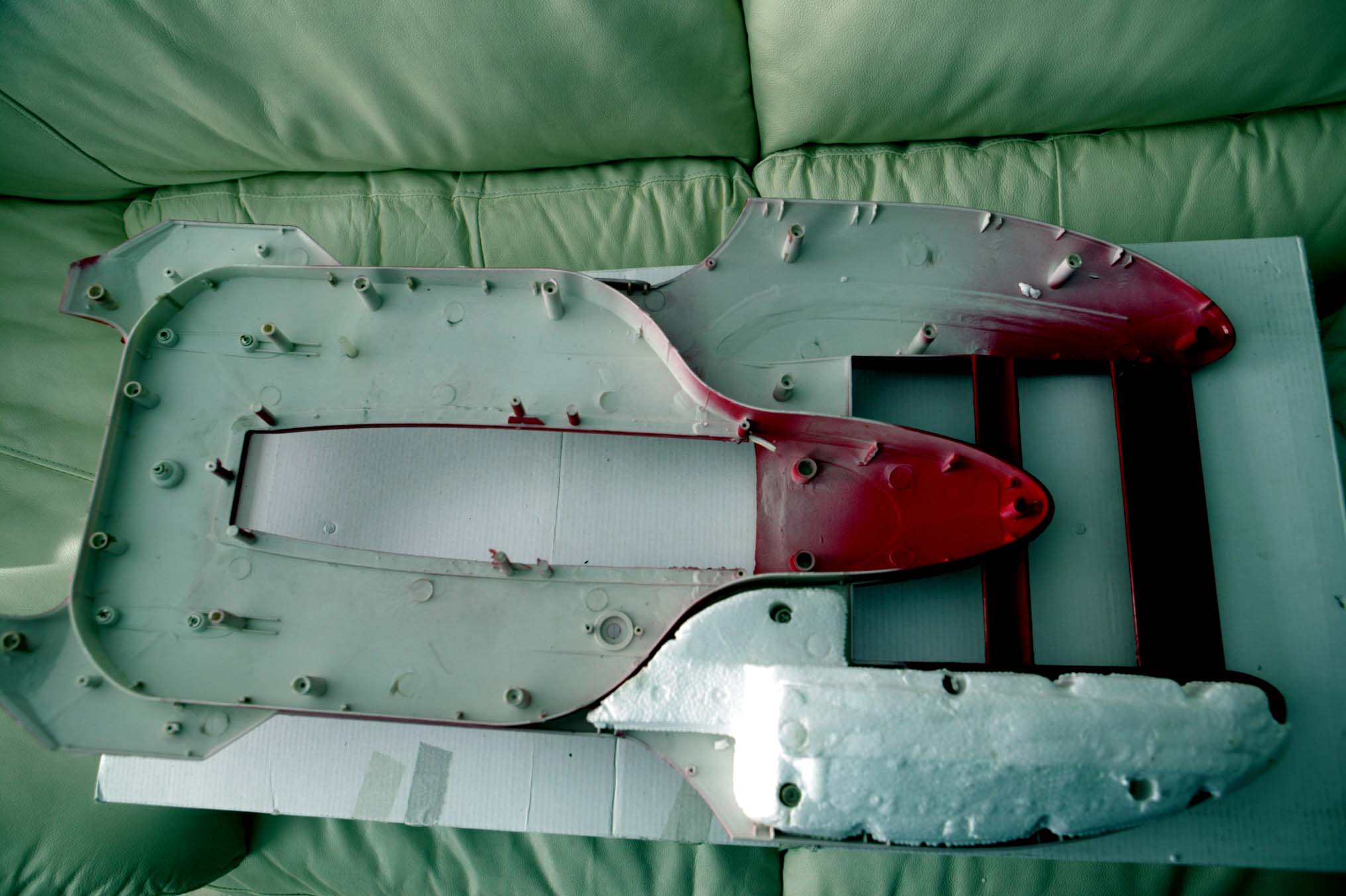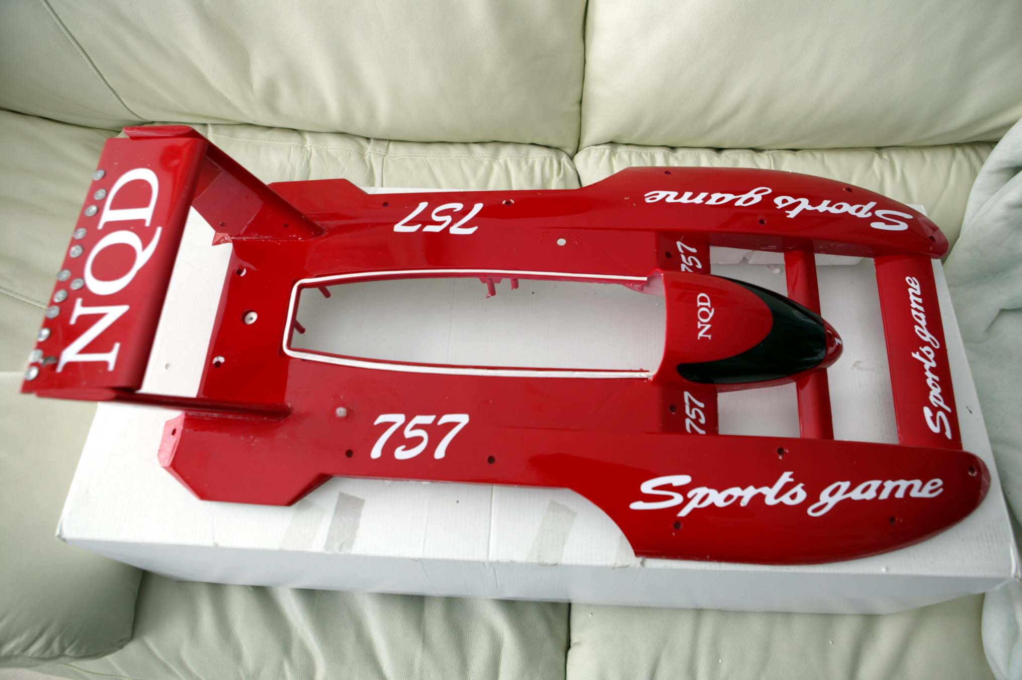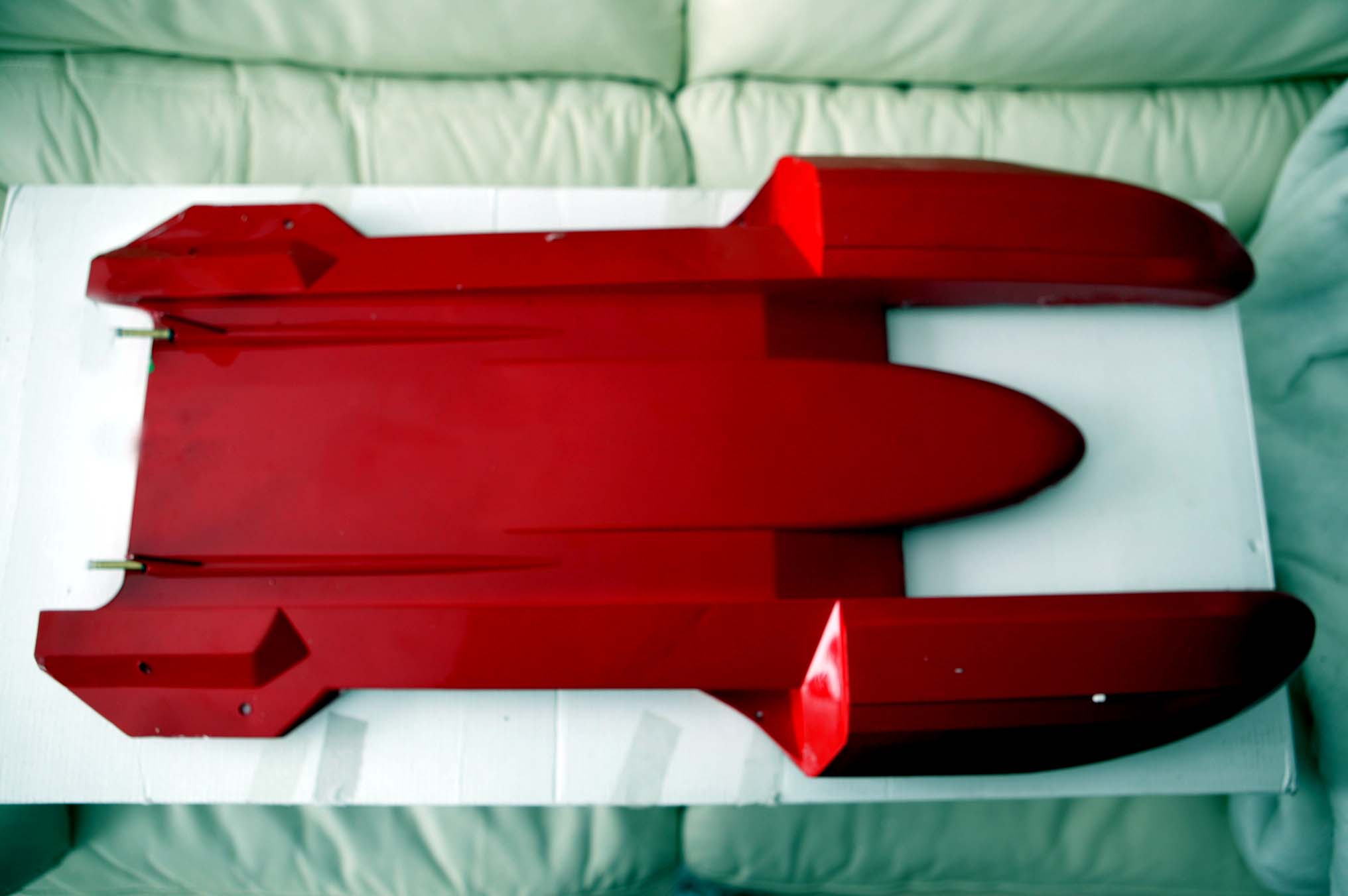 Puedes optar por un timón en el centro del casco.. o dos timones.. uno en cada lateral. lo que mas que guste. Para la medida... el timón tiene que sumergirse por debajo de la hélice el equivalente al diámetro de la misma. Es decir.. si la hélice mide 30mm.. el timón.. tiene que ser de largo.. 30mm mas que el punto mas bajo de la hélice.. Así, siempre tendrás control de la dirección.. incluso cuando la hélice esté fuera del agua. De todos modos.. por el modelo de tu casco.. la popa, no debería de despegarse del agua.