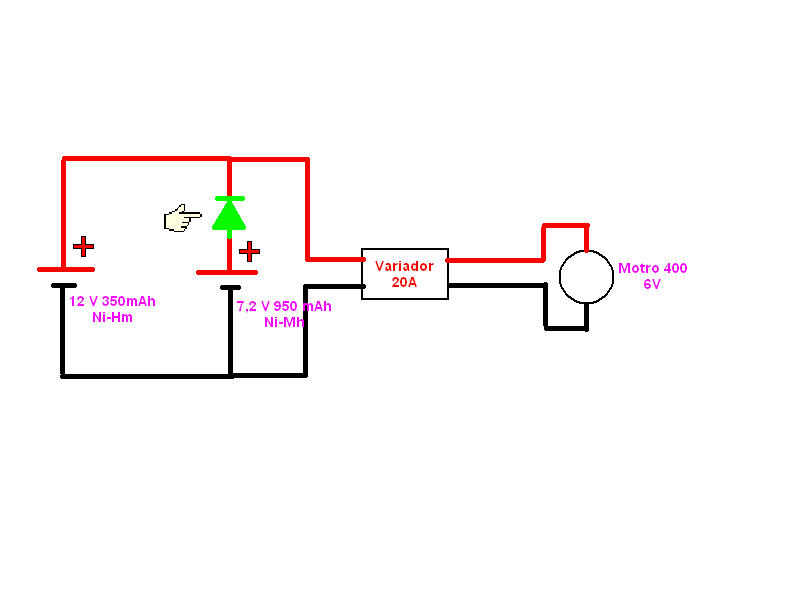 Probe a ponerle al avion los dos paquetes de 7,2 v en paralelo y volar volaba pero iba muy pesado y parecia que le faltaba fuerza. Ahora habia pensado en poner en paralelo la de 12 v y una de 7,2v, ya se que 12v es mucho para el motoro de 400 6v pero lo que hare es no darle a todo gas al principio. Pero mi duda esta en que pasara al poner dos baterias de distinto voltaje en paralelo, la bateria pequeña en este caso 7,2 podria dañarse al estar la bateria de 12v dandole carga? para que eso no pasara se me ocurrio la idea de ponerle un diodo para impedir el paso hacia la bateria pequeña, alguien que sepa de electronica me podria decir si este esquema funcionaria o si tiene una idea mejor que me la diga. El diodo pues no se cual poner pero alguno gordote tendra que ser para que aguante el consumo del motor. Venga electronicos una ayudita.