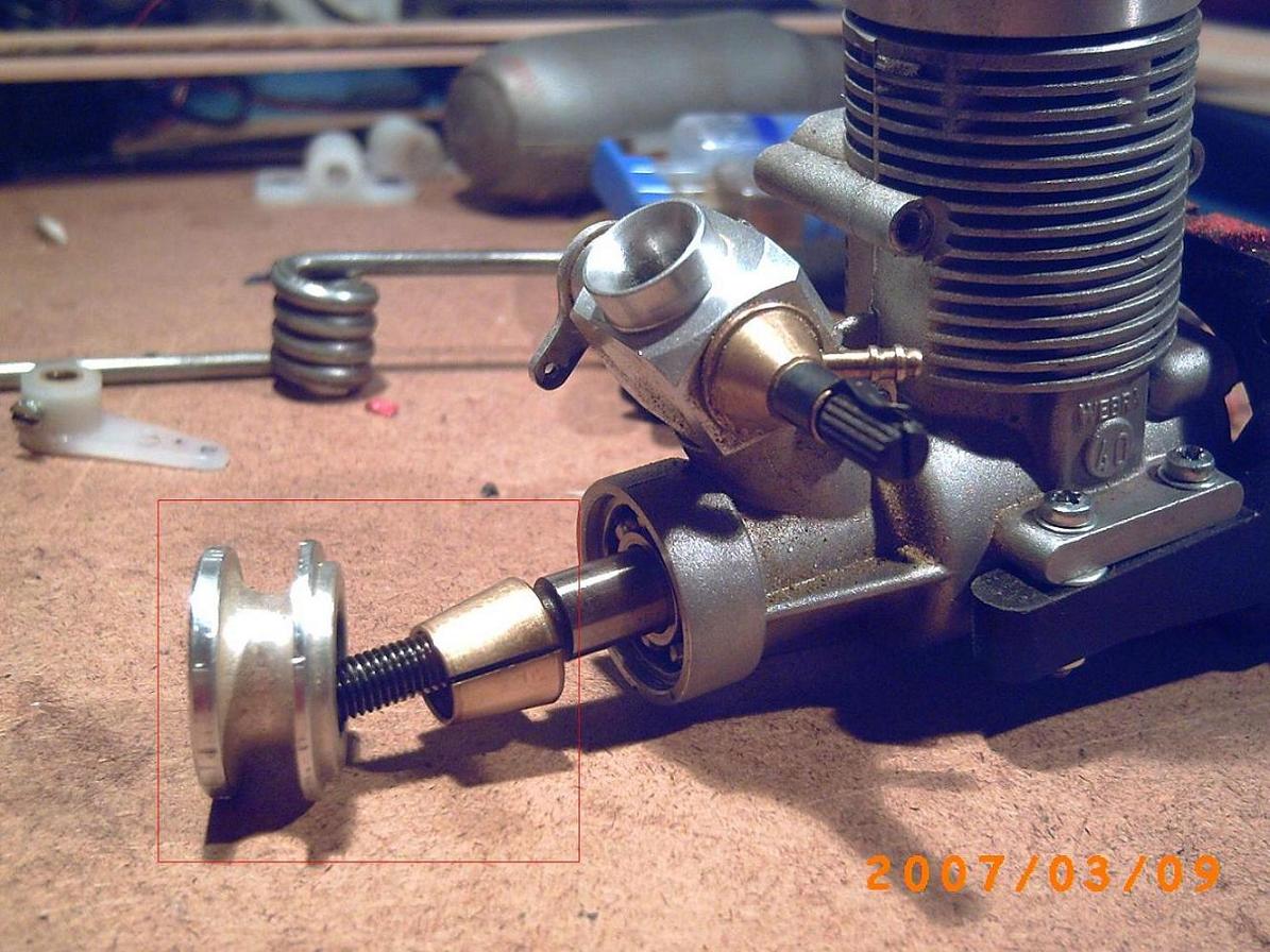 cuando he llegado a casa, para reparar el avion, he desmontado el cono, la helice y me doy cuenta de que el "portahelices", la pieza que enmarco en rojo, esta suelta y que aparece un casquillo, dejando al descubierto el rodamiento. Esto no me habia pasado antes, cuando en otras ocasiones habia cambiado la helice por otra.