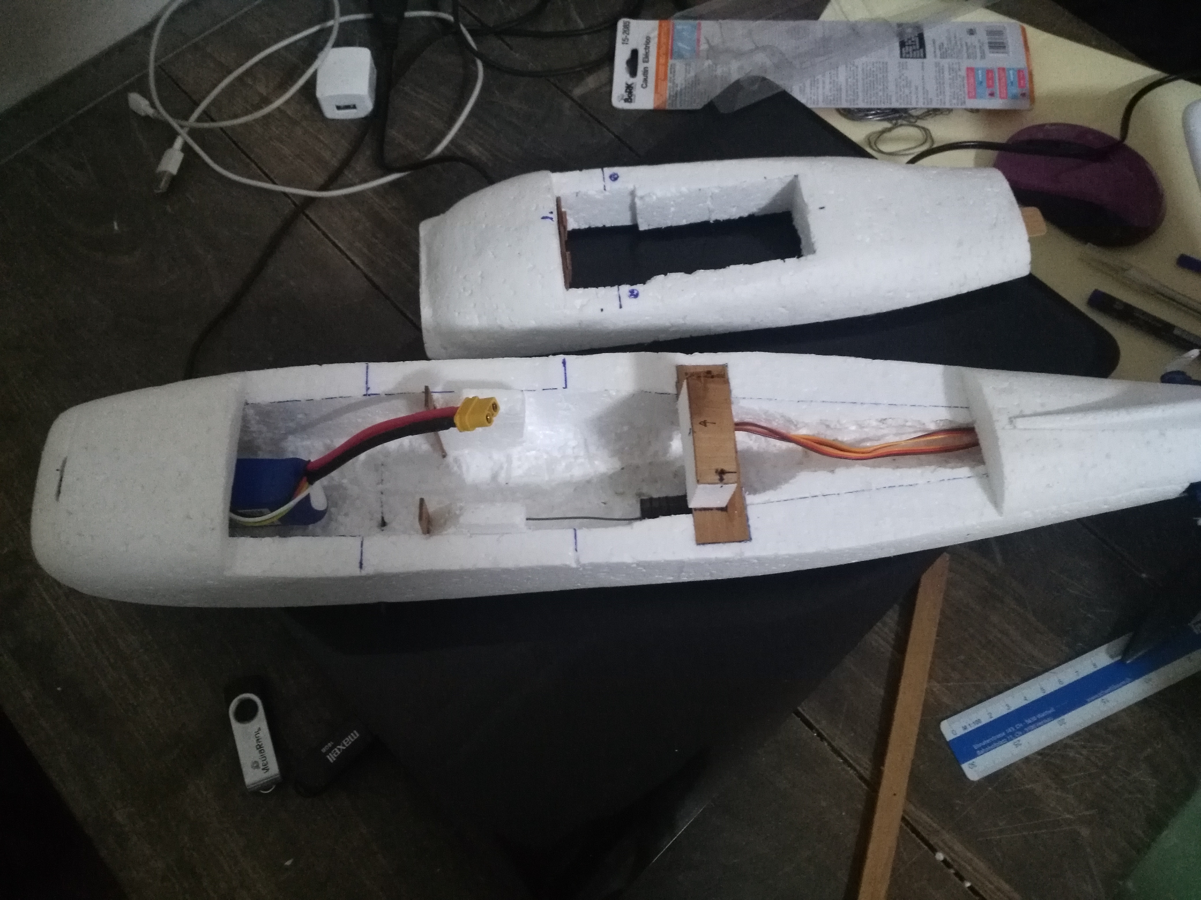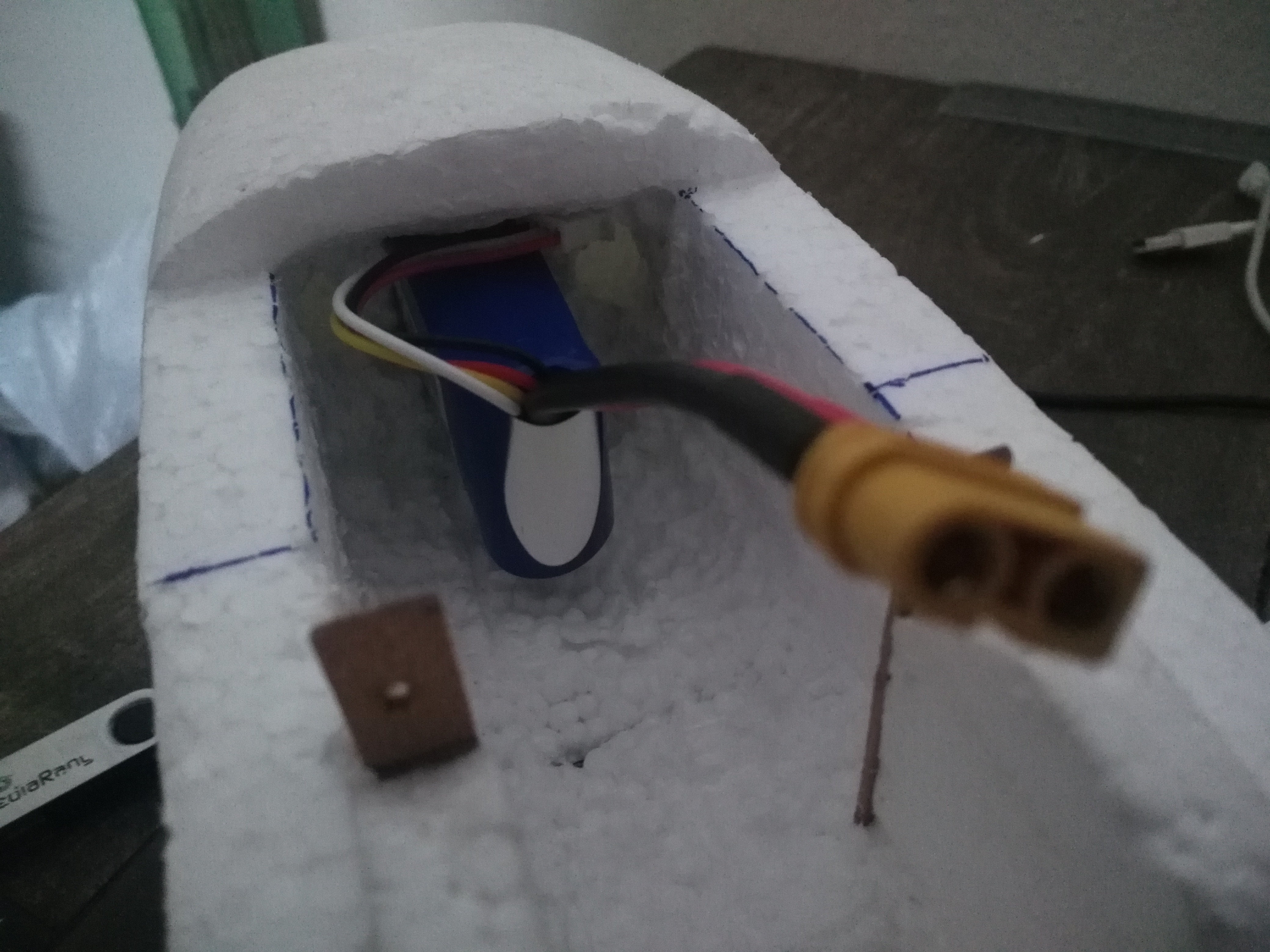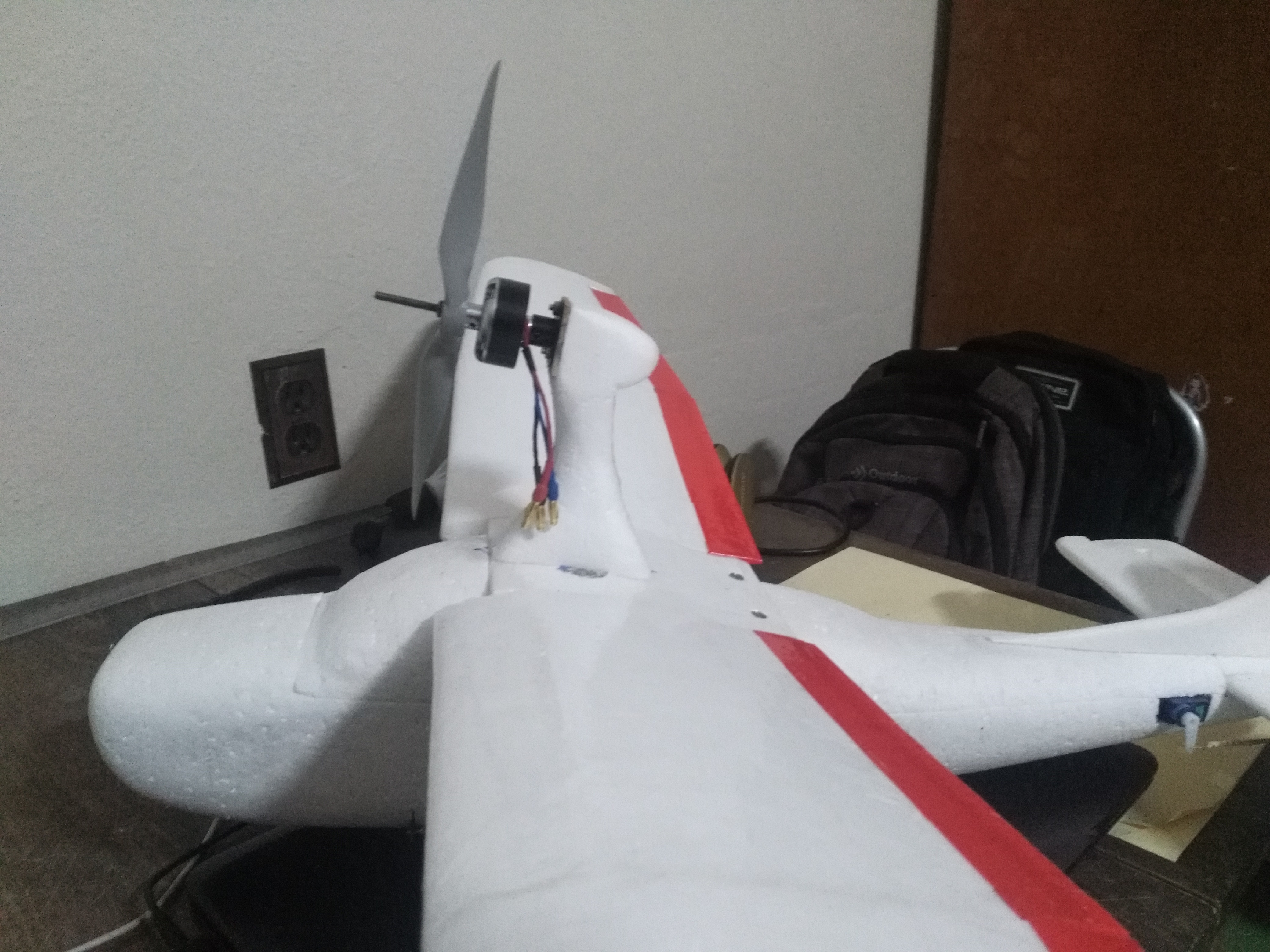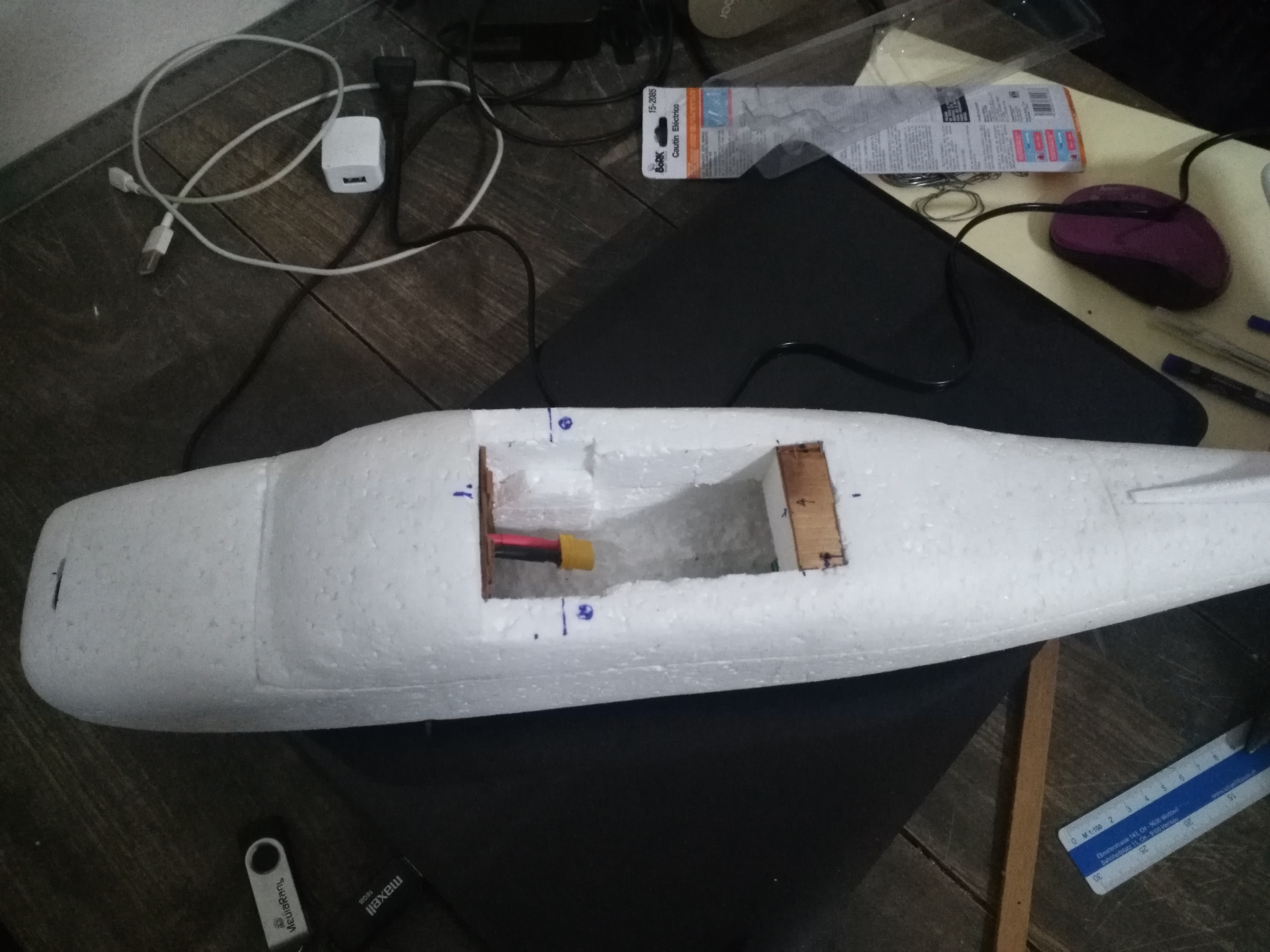 Mi problema es que cuando tenía el avioncillo ya casi terminado (1.10 m de envergadura), he visto estos modelos pushers, con la helice resguardada, ideales para novatos (por el tema de no romperlas). Pero para cuando descubrí esto, ya tenia el avioncillo casi terminado, entonces.... decidi montar el motor sobre las alas... vaya usted a saber de donde saqué la idea... quizas es una mostruosidad... pero bueno, ya está echo...