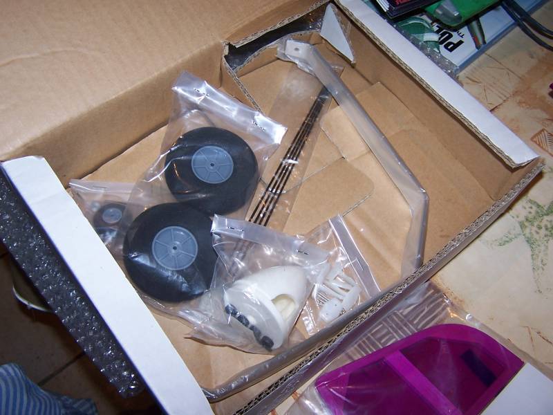 Entelado en oracover lila transparente y blanco, viene con todo lo necesario. Ruedas de espuma, tren en aluminio (algo frágil a simple vista), cono de plástico horns, kwik-links y transmisiones en varilla.