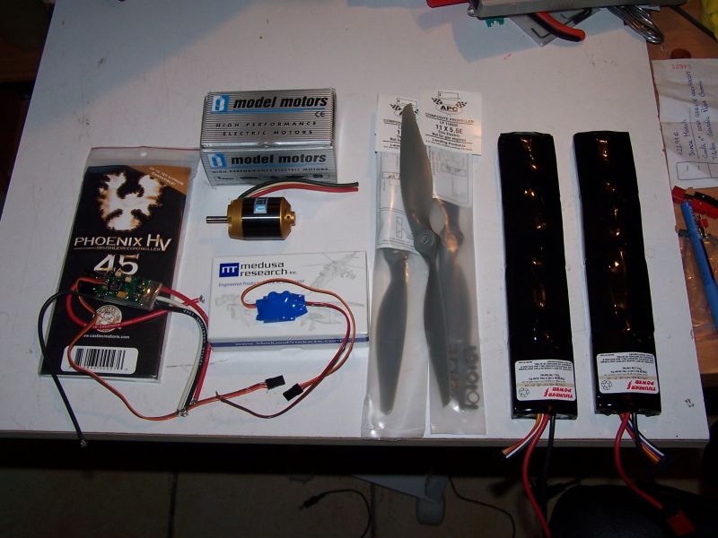 Axi 28/26-10, Phoenix-45 HV, UBEC Potentia 5V 2A, servos HS-85BB y baterías 4S (aún por decidir)