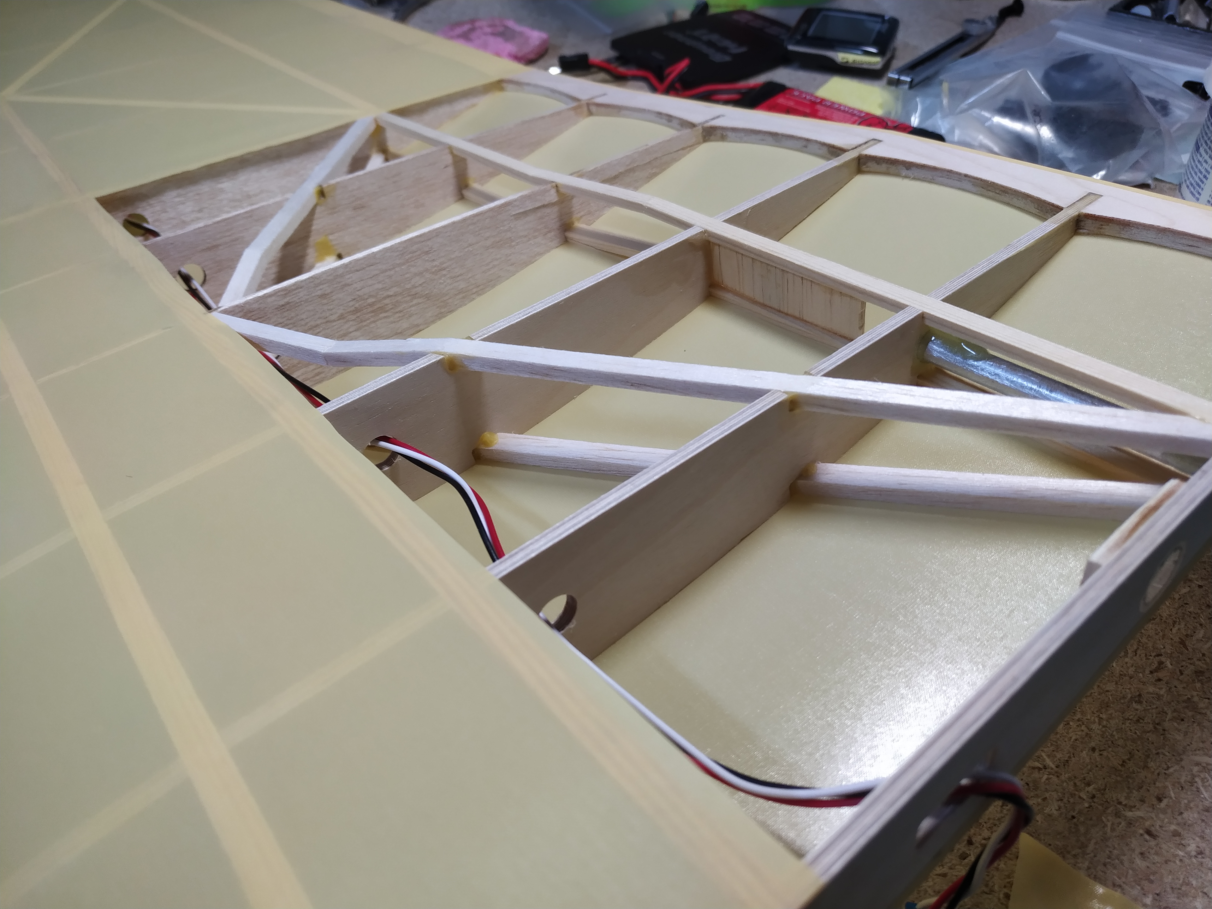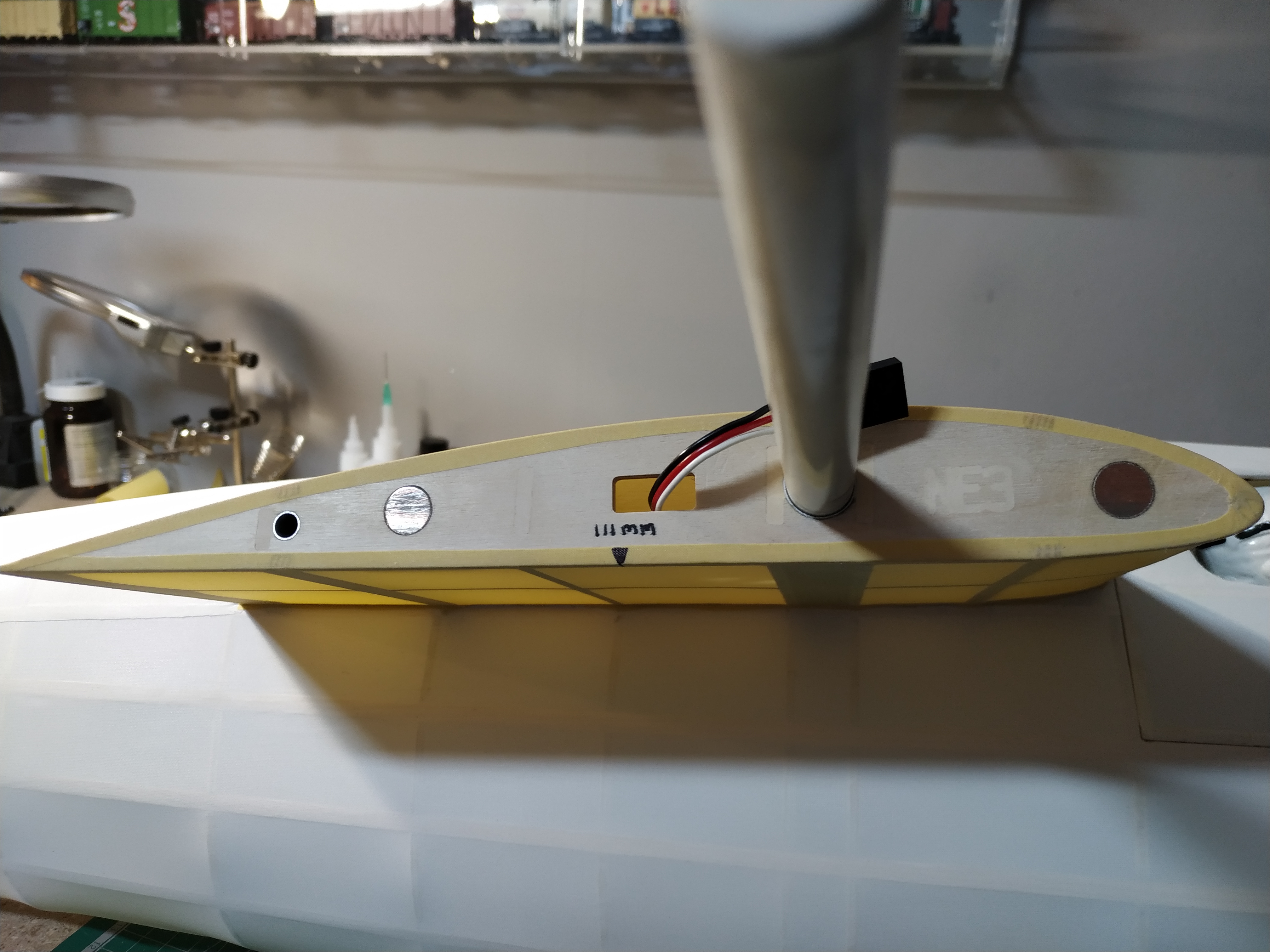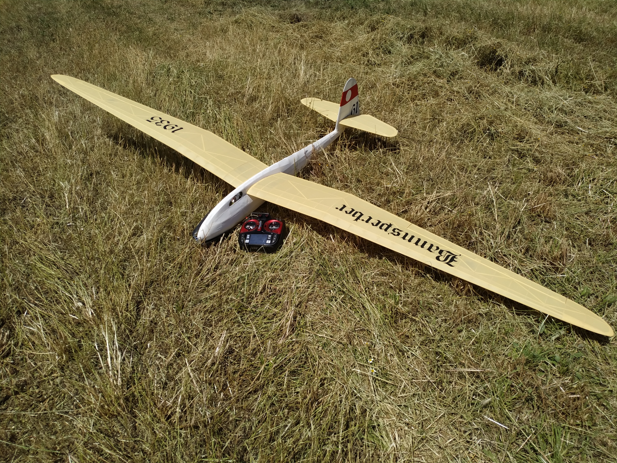 Pues nada, al aire otra vez, no se, no lo veo ahora, le doy trim pabajo, tampoco me gusta, pues ahora, parriba, no, tampoco, empiezo a pensar que la he cagado tocando el trim, vuelo un rato, y lo aterrizo, y voy a por el meditando porqué no me gusta tanto como el primer vuelo, lo cojo, preparado para un tercer intento.......¿que leches sobresale y empuja el recubrimiento?, abro la cabina, vale, ahora lo entiendo todo, el plomo del morro, se ha soltado y desplazado hasta la mitad de la batería, así no volaba tan bien, jejeje, pues nada, ya, para el próximo día, pero el avión, ha pasado la prueba, bastante contento.