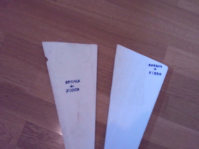 Tenia varias duduas a la hora de entelar una ala volante, hice varias pruebas del nuevo metodo que alguna vez habeis comentado por aqui, y la verdad que no queda mal y durito (barniz+fibra)...Pero no tiene nada que ver como siempre se a hecho con Resina, queda mucho mas duro, mas rigido,no flexa nada....Dejando caer un punzon bien afilado, Barniz+fibra no lo aguantaba, la Resina si...
