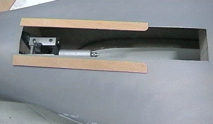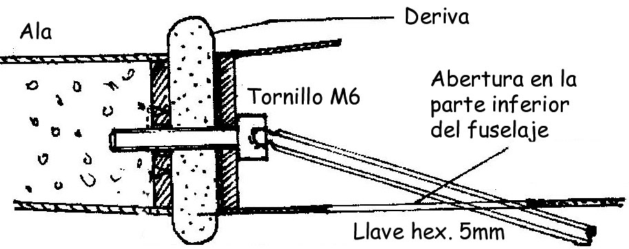 Pines de alineamiento en redondo de madera de haya y sujeción de las alas mediante tornillo allen de aluminio a la costilla del fuselaje.