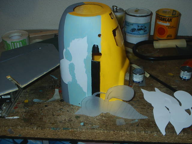 Bueno, no me dio tiempo a comprar pilas. Basicamente he estado pintando a brocha y gastando cinta scott a mansalva. El trabajo de momento se reduce a dar verde (71), gris (02) y amarillo (04). Mas tarde me liaré con disolventes, grafitos, mahous y cafés :D