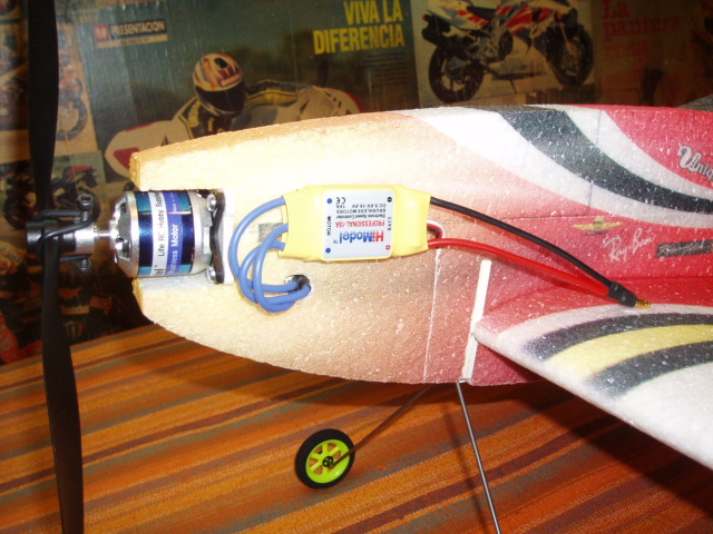 Las partes de depron estan forradas con aeronflix, para darle mas rigided y aparte que no se marque tanto con los roces,tambien lleva un puente de carbono en profundidad,vereis que todo el cableado de servos y demas cables va por la parte de abajo del fuselaje metido por cortes hasta el cajeado que hice para el receptor, y tambien llega el cable del variador,luego los cables se quedan en un hueco del cajeado,luego se tapa y no se ve casi ningun cable por medio,solo el variador y la bateria.