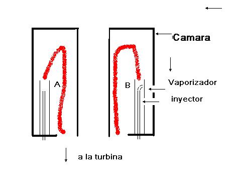 Los inyectores deben ir montados como en la B, o sea, apuntando a la pared del tubo. No te de apuro si el inyector toca la pared del tubo. La función de los vaporizadores es justamente la que su nombre indica, vaporizar el queroseno. Estos están al rojo vivo en funcionamiento, ( los puedes ver si te asomas por el culo con el motor en marcha, ( mejor con un espejo)), y al impactar el chorro de queroseno contra su pared, éste se convierte en fase gas, y se quema de forma eficiente al salir por el fondo del vaporizador. Si el chorro apunta recto hacia el fondo, el vaporizador no hace su papel, el queroseno entra a la cámara en forma líquida, se quema en su tránsito por la cámara y llega al NGV todavía ardiendo, produciendo puntos calientes y excesos de temperatura. Si pusiste ayer los inyectores, debes posicionarlos bien, notarás la diferencia.