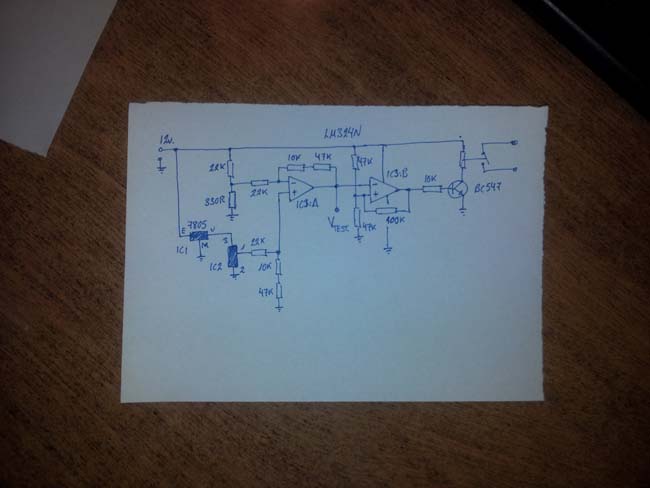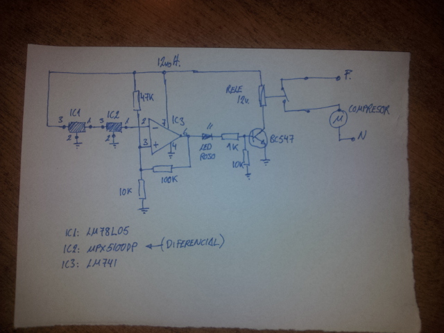 Bueno hoy he intentado usar el NE5532 pero debido a que sus salidas son estables con un valor superior a 1,4volt y las entradas no se pueden usar como comarador de CC he tenido que dejar el LM324. La pena es que me sobra la mitad del chip. A menos que se use un LM741 solo como comparador pero las lecturas del vacio hay que hacerlas con un manometro analogico y nos ahorramos pasta. En este esquema falta poner un diodo led rojo en serie a la resistencia de base del transistor que se enciende con el compresor y evita que este siempre activado pues la tension cero de la salida del 741 es de 1.4volt el potenciometro de 47K puede estar sobre los 10K para una presion de -0.6 de paro y -0.5 de arranque. Este circuito sera en mi caso el que montare pues no necesito más por lo pronto ya que tengo el manometro y si un dia pongo un voltimetro usare el esquema anterior.